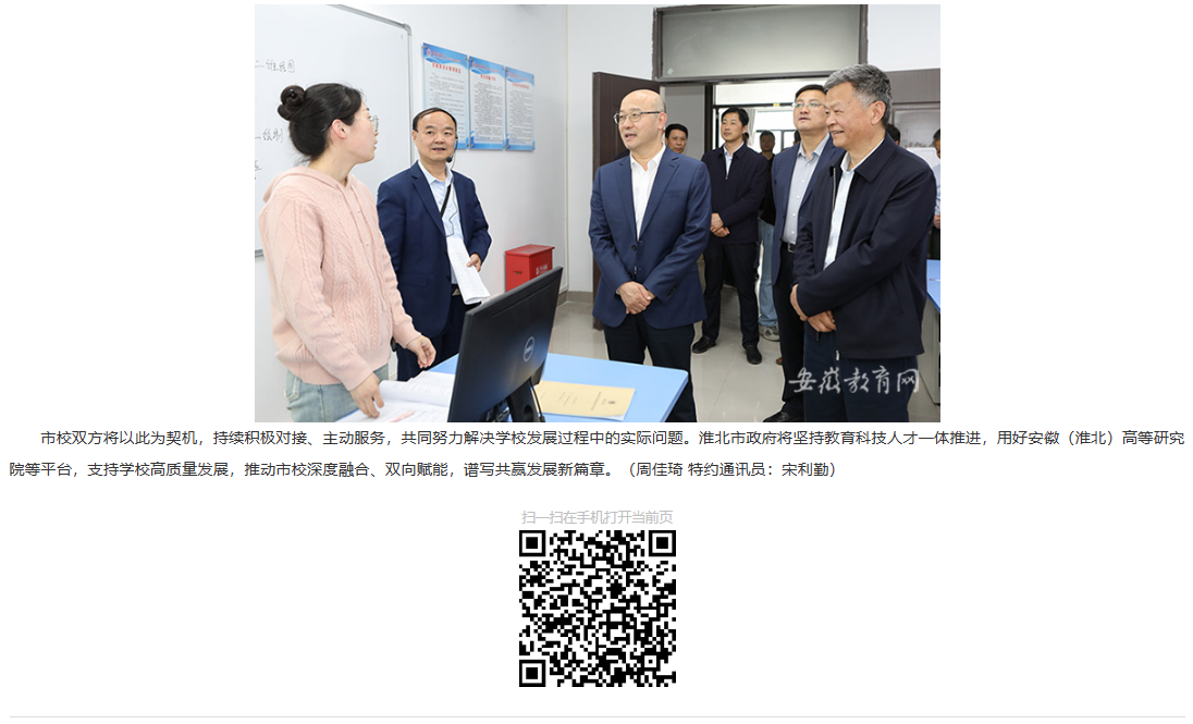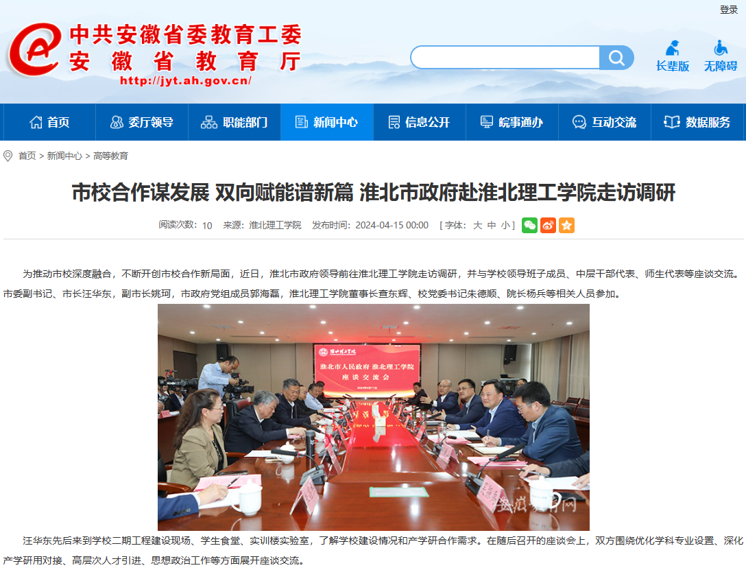 为推动市校深度融合,不断开创市校合作新局面,近日,淮北市政府领导前往淮北理工学院走访调研,并与学校领导班子成员、中层干部代表、师生代表等座谈交流。市委副书记、市长汪华东,副市长姚珂,市政府党组成员郭海磊,淮北理工学院董事长查东辉、校党委书记朱德顺、院长杨兵等相关人员参加。对此,安徽教育网进行了报道: