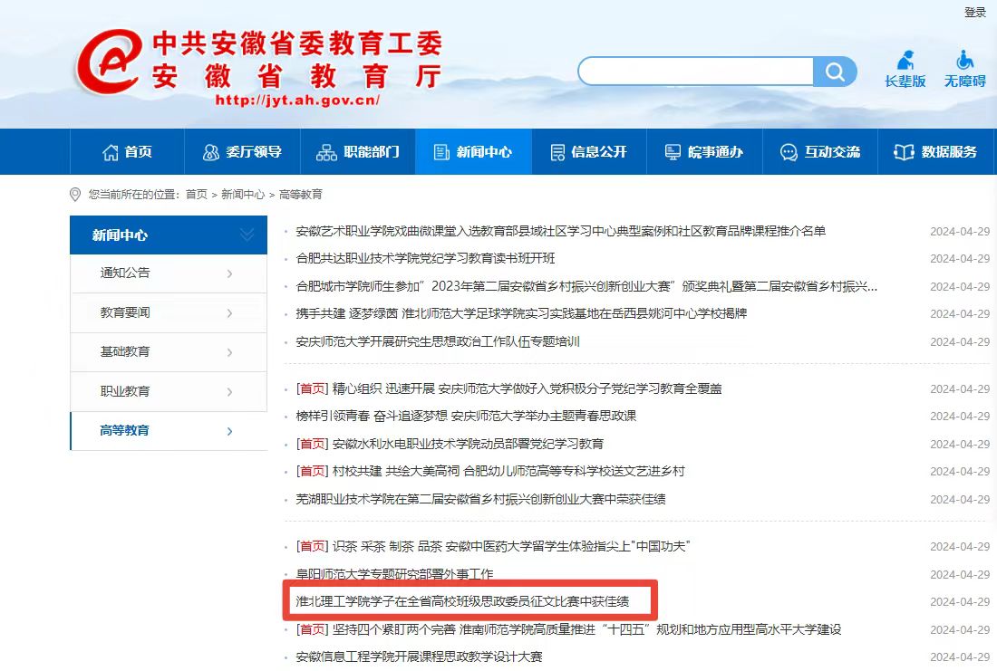 近日,由安徽省高等学校思想政治教育研究会主办的全省高校班级思政委员征文比赛结果公布,淮北理工学院首次参加比赛的两篇征文均获奖。对此,安徽教育网进行了报道: