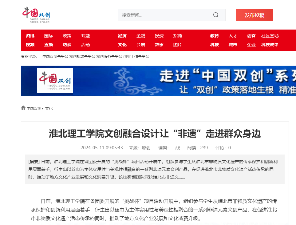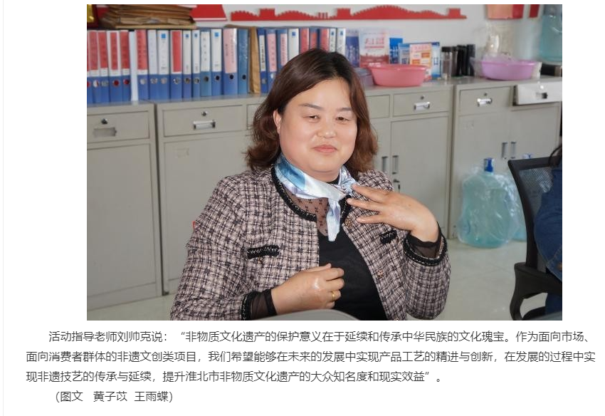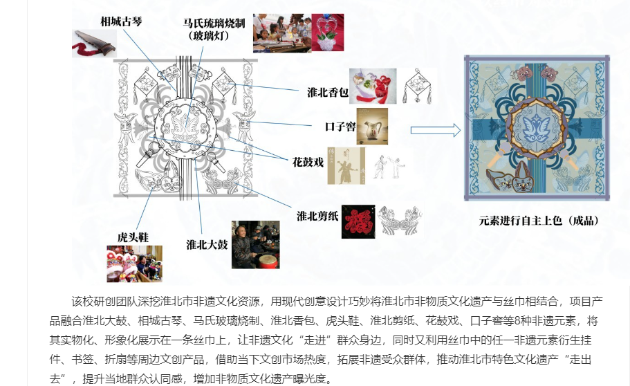 日前,淮北理工学院在省团委开展的“挑战杯”项目活动开展中,组织参与学生从淮北市非物质文化遗产的传承保护和创新利用层面着手,衍生出以丝巾为主体实用性与美观性相融合的一系列非遗元素文创产品,在促进淮北市非物质文化遗产活态传承的同时,推动了地方文化产业发展和文化消费升级。对此,中国双创网进行了报道: