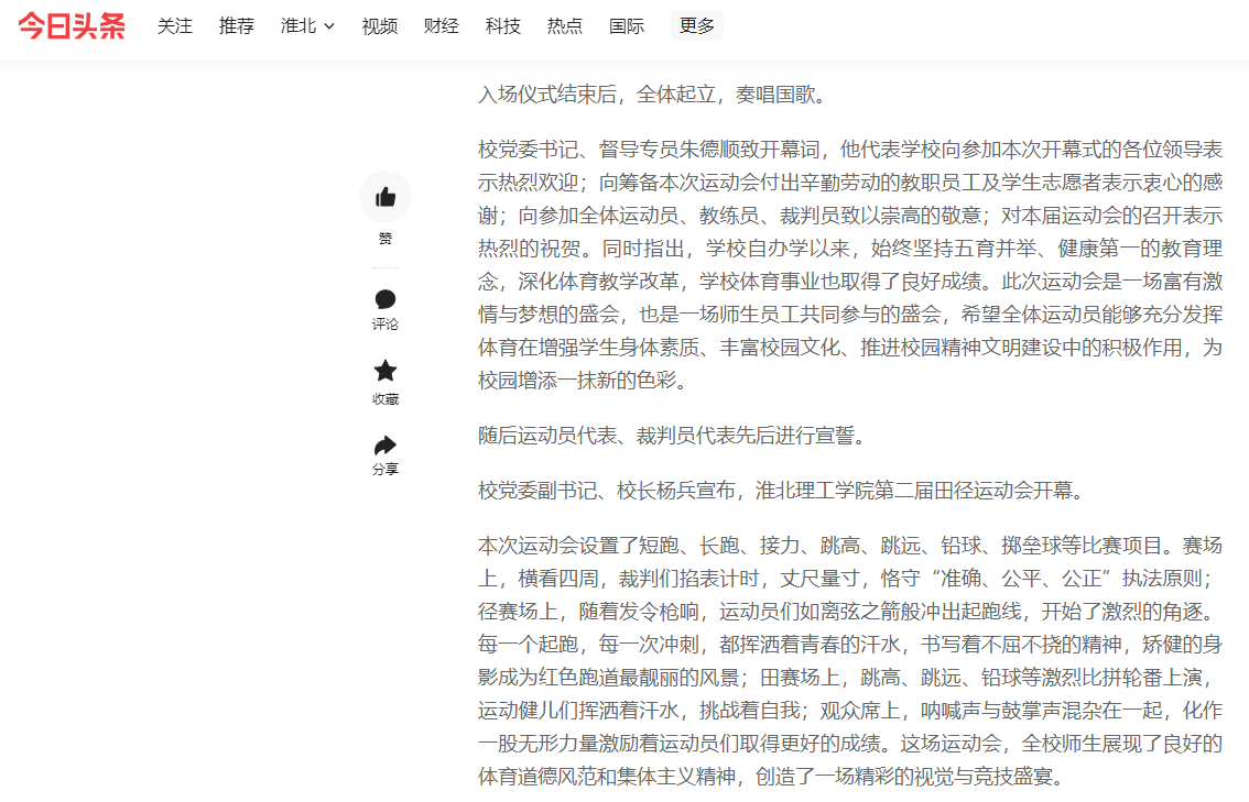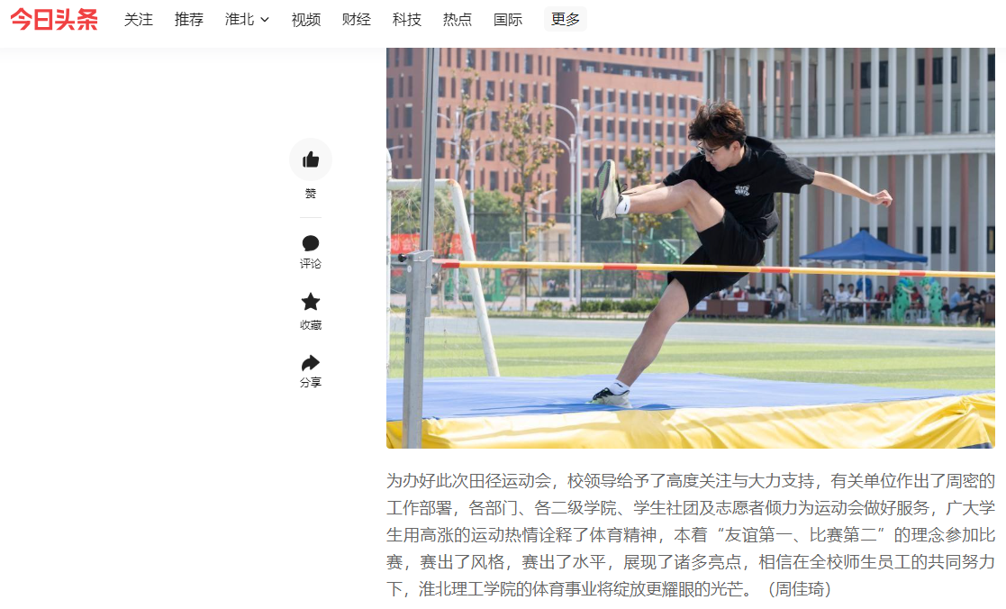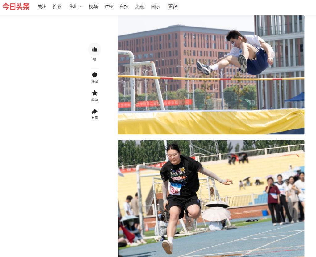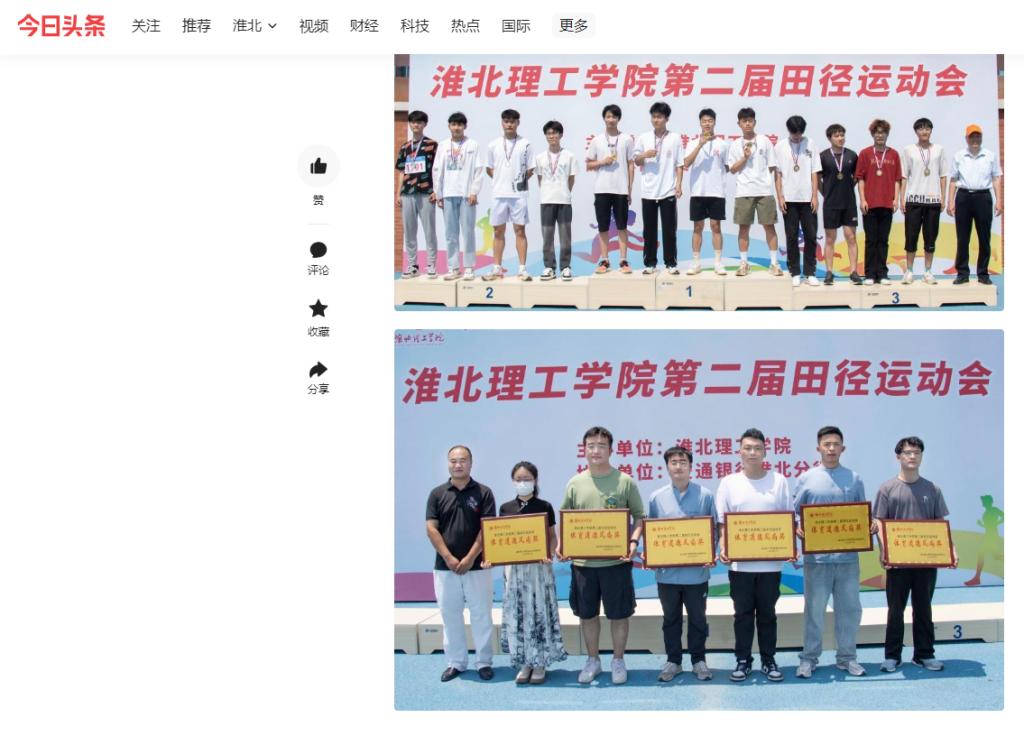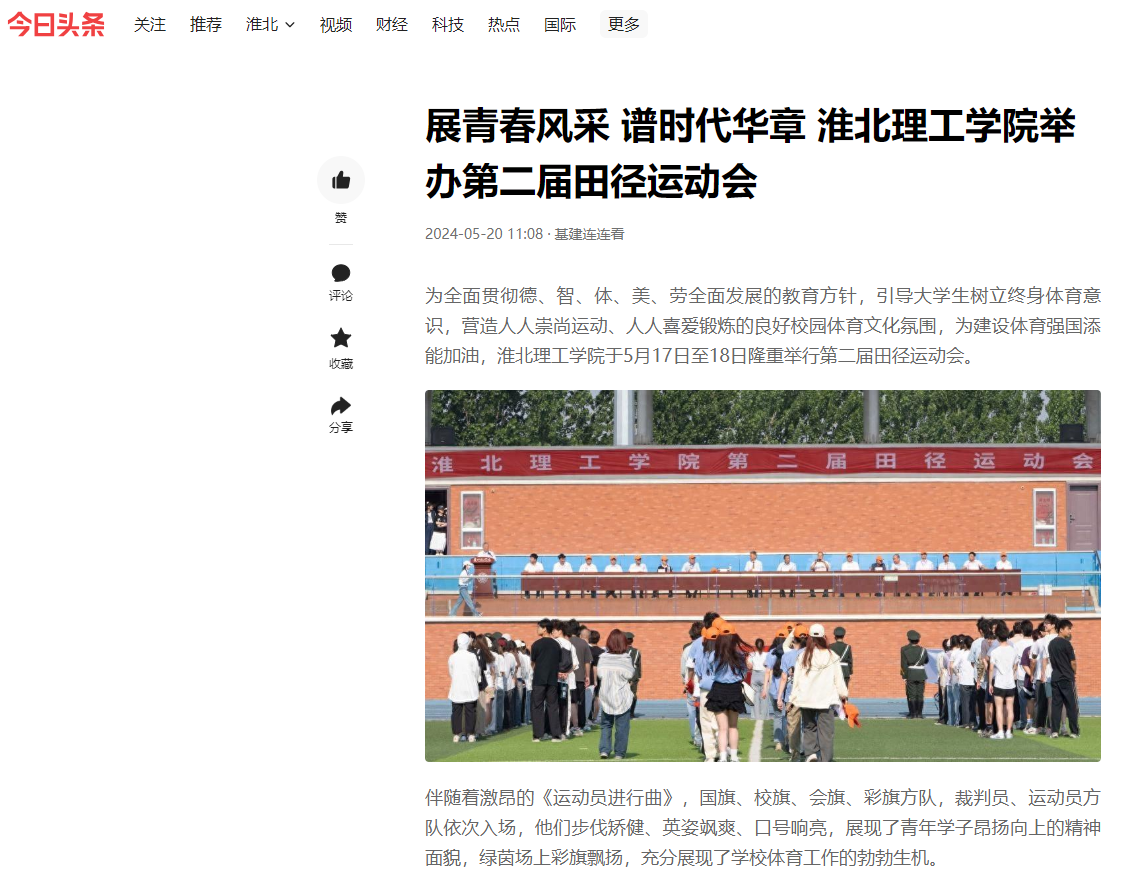 为全面贯彻德、智、体、美、劳全面发展的教育方针,引导大学生树立终身体育意识,营造人人崇尚运动、人人喜爱锻炼的良好校园体育文化氛围,为建设体育强国添能加油,淮北理工学院于5月17日至18日隆重举行第二届田径运动会。对此,今日头条进行了报道: