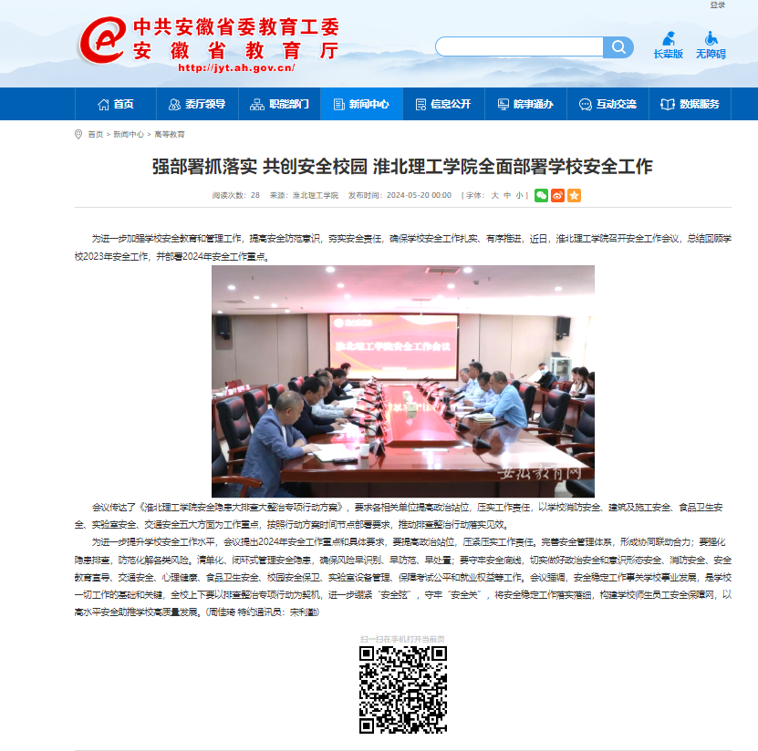 为进一步加强学校安全教育和管理工作,提高安全防范意识,夯实安全责任,确保学校安全工作扎实、有序推进,近日,淮北理工学院召开安全工作会议,总结回顾学校2023年安全工作,并部署2024年安全工作重点。对此,安徽教育网进行了报道:
