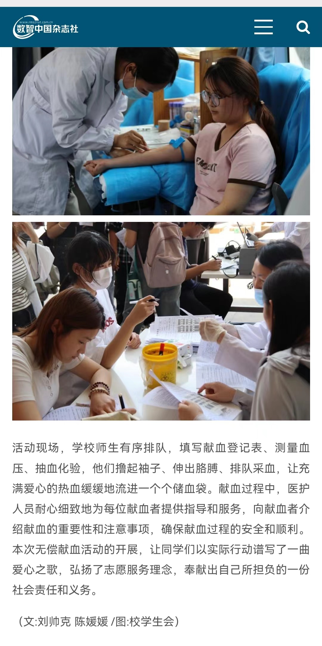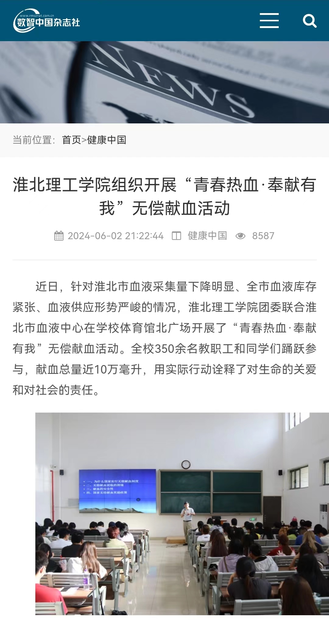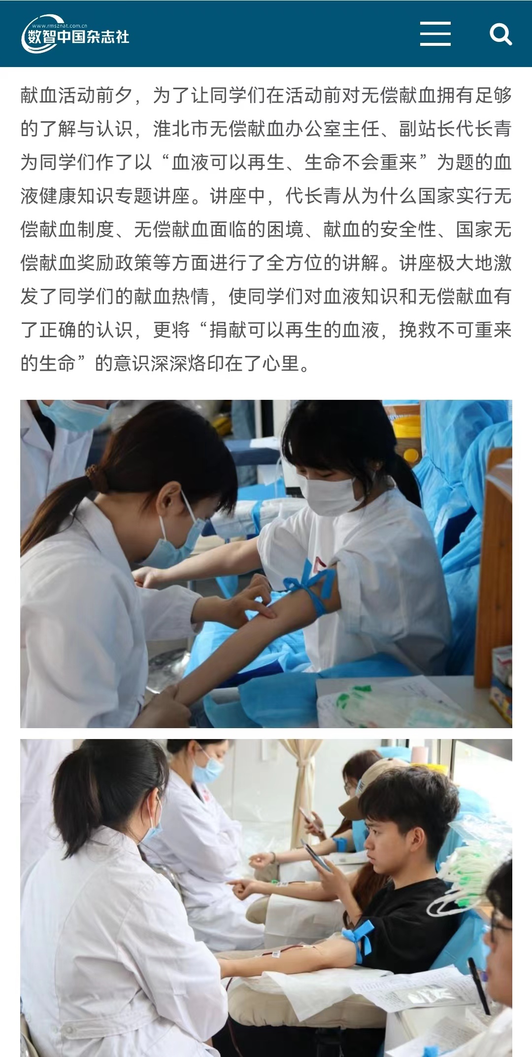 近日,针对淮北市血液采集量下降明显、全市血液库存紧张、血液供应形势严峻的情况,淮北理工学院团委联合淮北市血液中心在学校体育馆北广场开展了“青春热血·奉献有我”无偿献血活动。对此,数智中国杂志社-健康中国栏目进行了报道: