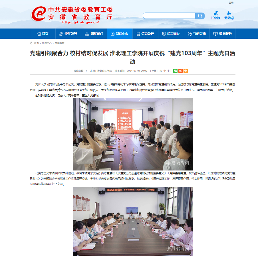 为深入学习贯彻习近平总书记关于党的建设的重要思想,进一步推动党纪学习教育走深走实,充分发挥党建引领作用,促进校与村党建共建发展。在建党103周年来临之际,淮北理工学院党委书记朱德顺带领有关部门负责人、党支部书记及马克思主义学院教师代表与淮北市杜集区李洼村党总支开展庆祝“建党103周年”主题党日活动。对此,安徽教育网进行了报道: