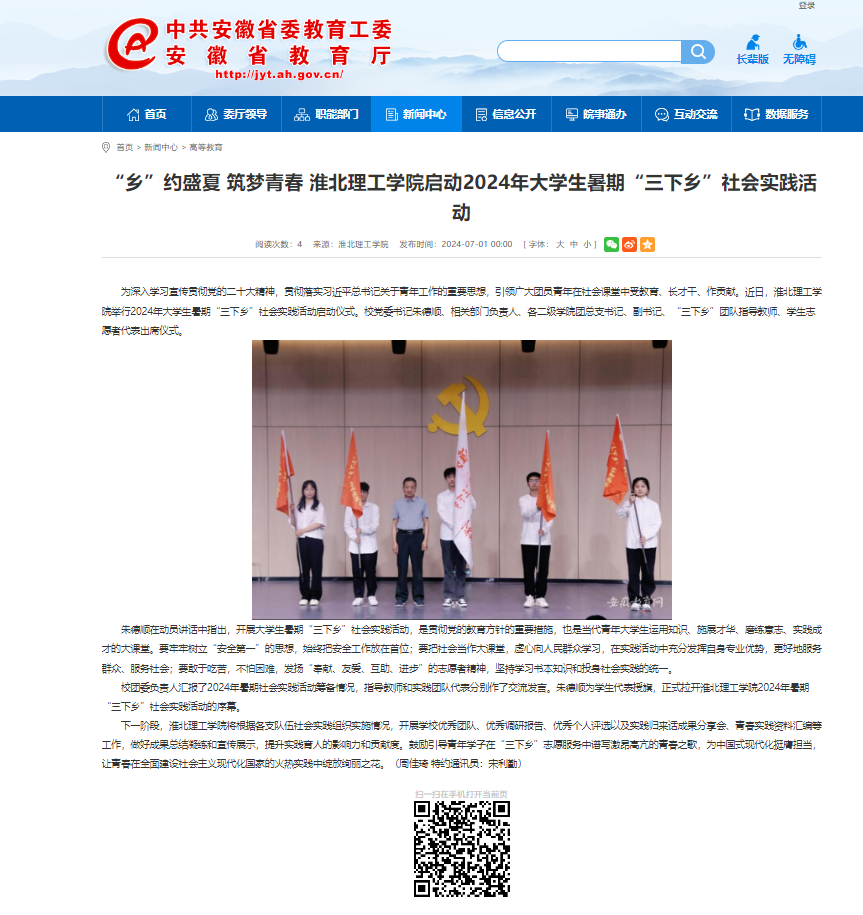 为深入学习宣传贯彻党的二十大精神,贯彻落实习近平总书记关于青年工作的重要思想,引领广大团员青年在社会课堂中受教育、长才干、作贡献。近日,淮北理工学院举行2024年大学生暑期“三下乡”社会实践活动启动仪式。校党委书记朱德顺、相关部门负责人、各二级学院团总支书记、副书记、“三下乡”团队指导教师、学生志愿者代表出席仪式。对此,安徽教育网进行了报道: