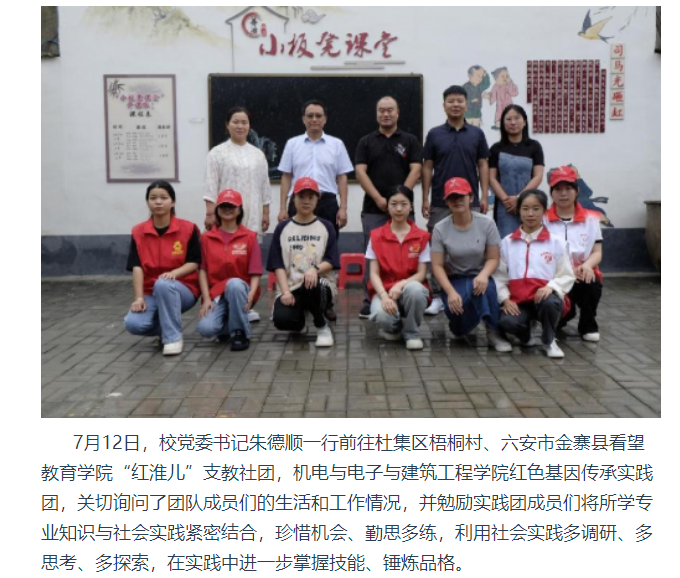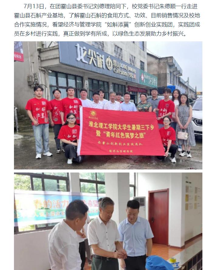 淮北理工学院大学生暑期“三下乡”社会实践活动启动以来,学校团员青年在各团队指导教师带领下奔赴祖国各地开展实践服务活动。为了切实了解我校暑期社会实践开展情况,7月9日至13日,校党委书记朱德顺、副校长郑来纪分别前往淮北市、六安市、合肥市等地,看望慰问社会实践团队师生,调研指导实践工作,进一步推进校地合作。学生处、校团委相关职能部门负责人陪同慰问。对此,中国网进行了报道: