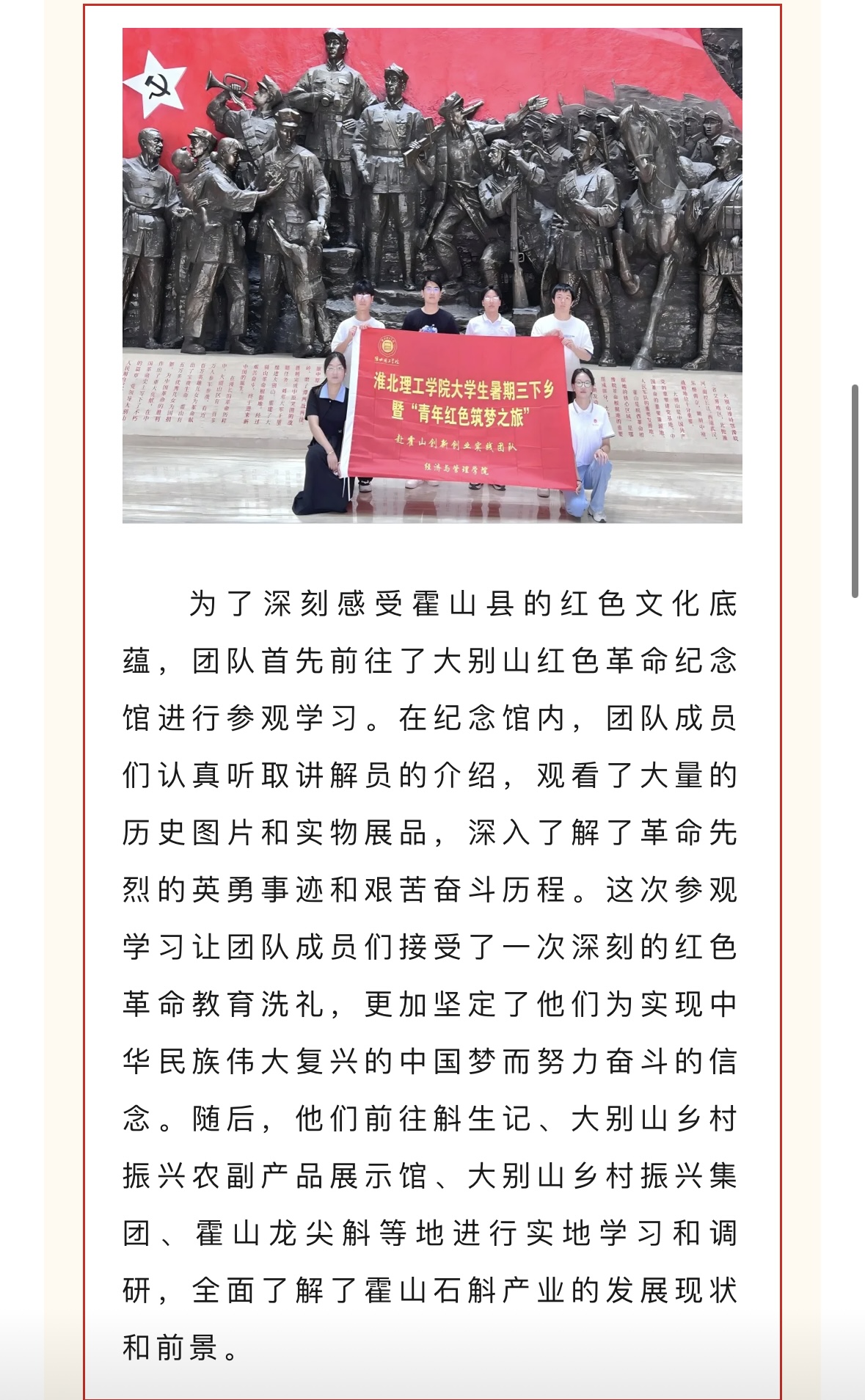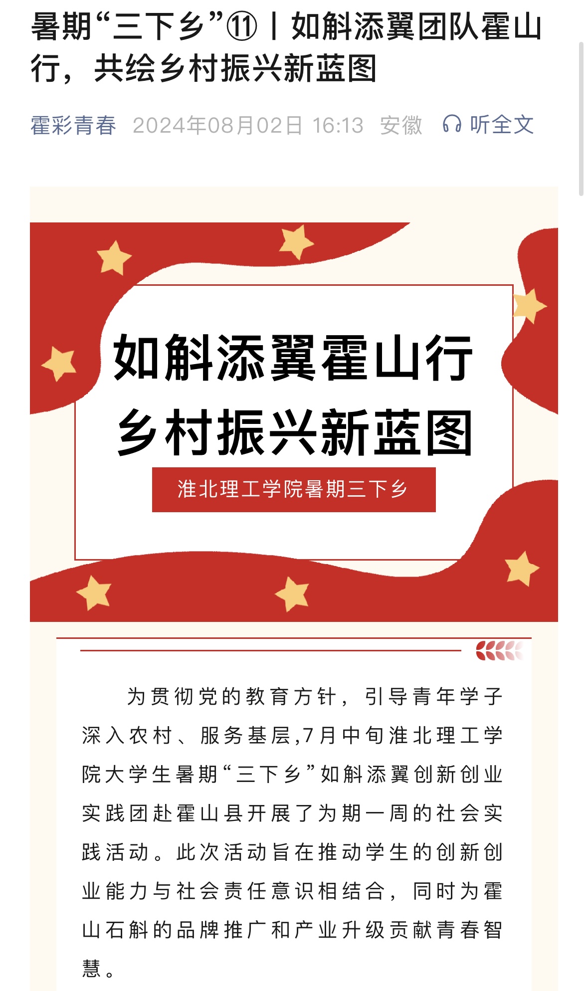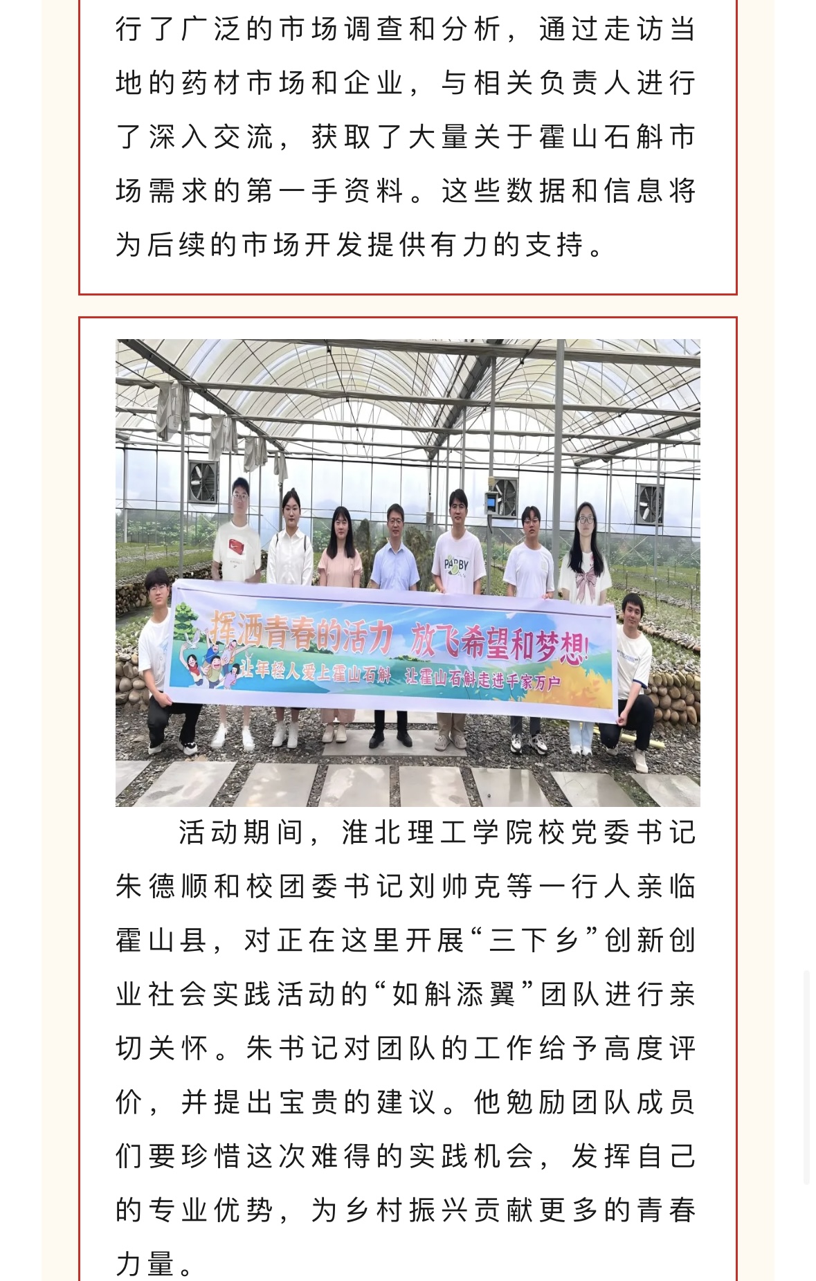 为贯彻党的教育方针,引导青年学子深入农村、服务基层,7月中旬淮北理工学院大学生暑期“三下乡”如斛添翼创新创业实践团赴霍山县开展了为期一周的社会实践活动。此次活动旨在推动学生的创新创业能力与社会责任意识相结合,同时为霍山石斛的品牌推广和产业升级贡献青春智慧。对此,霍彩青春进行了报道: