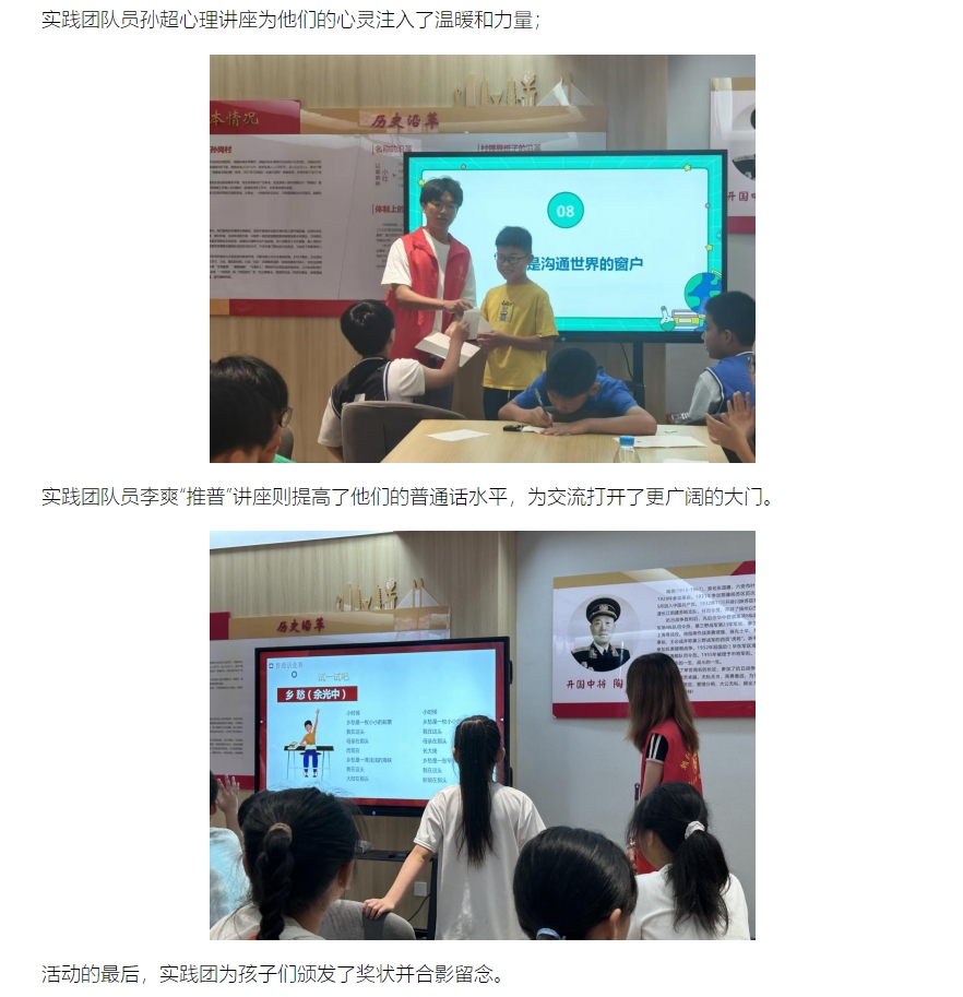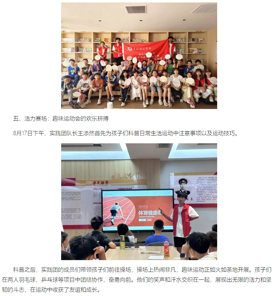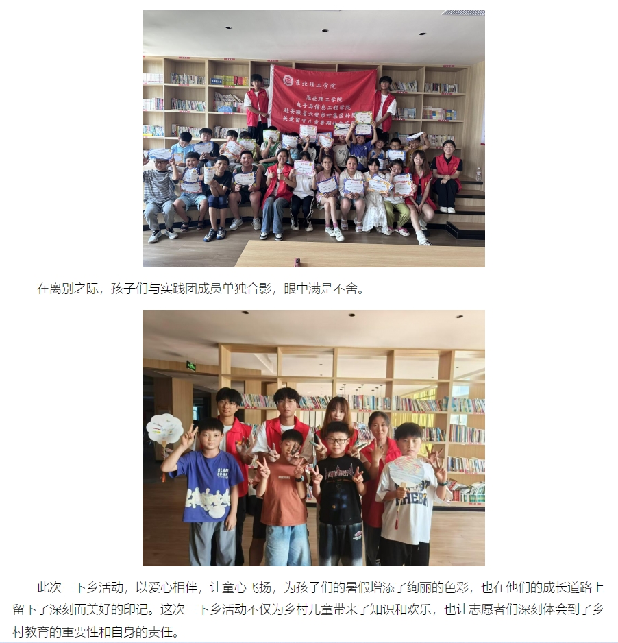 8月12日至8月18日淮北理工学院电子与信息工程学院“爱心相伴,童心飞扬”社会实践团赴六安市孙岗乡开展为期7天的暑期“三下乡”社会实践活动。此次活动以关爱乡村儿童为核心,旨在为孩子们带来丰富多彩的知识和欢乐,拓宽他们的视野,激发他们对未来的憧憬。让淮理工青年学子在青春实践中展现青春作为、彰显青春风采、贡献青春力量、抒写青春故事。对此,中国网中国国情进行了报道: