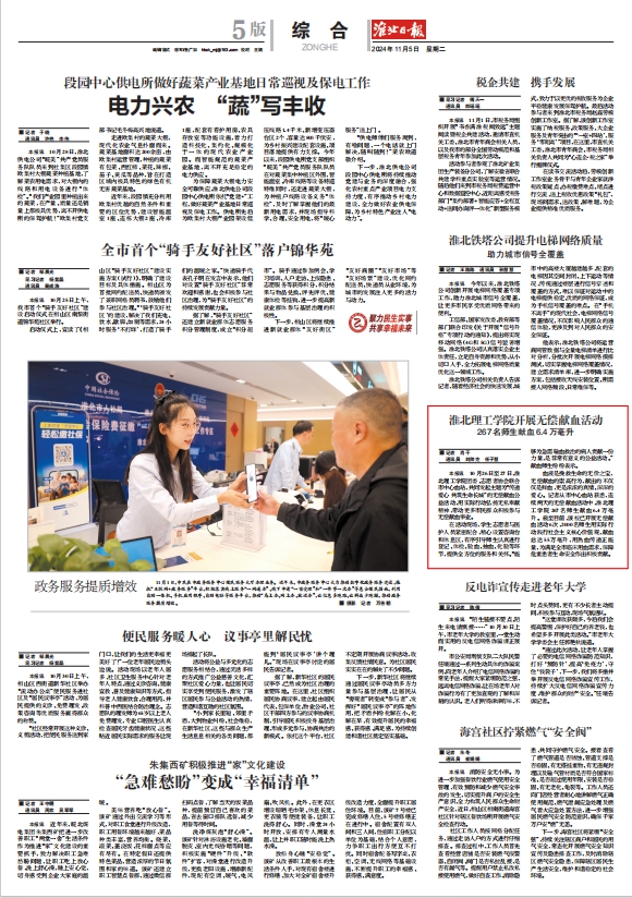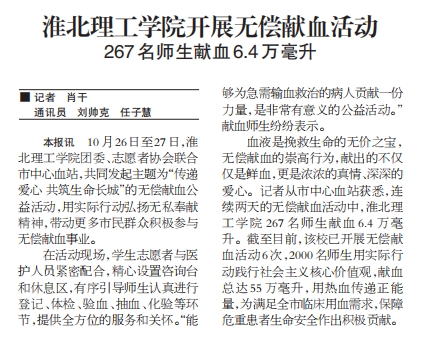 10月26日至27日,淮北理工学院团委、志愿者协会联合市中心血站,共同发起主题为“传递爱心 共筑生命长城”的无偿献血公益活动,用实际行动弘扬无私奉献精神,带动更多市民群众积极参与无偿献血事业。对此,淮北日报进行了报道: