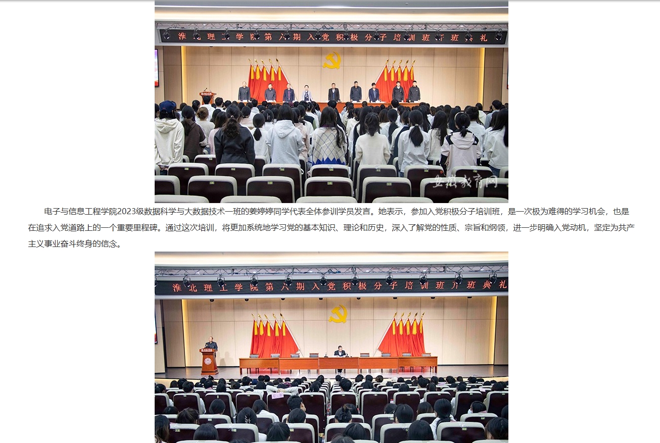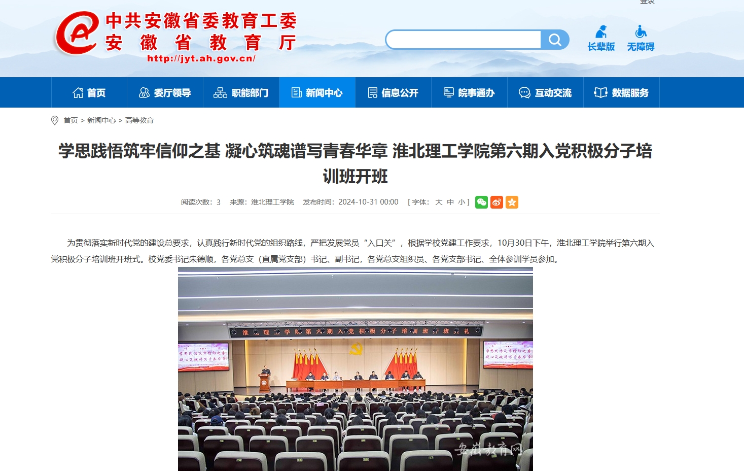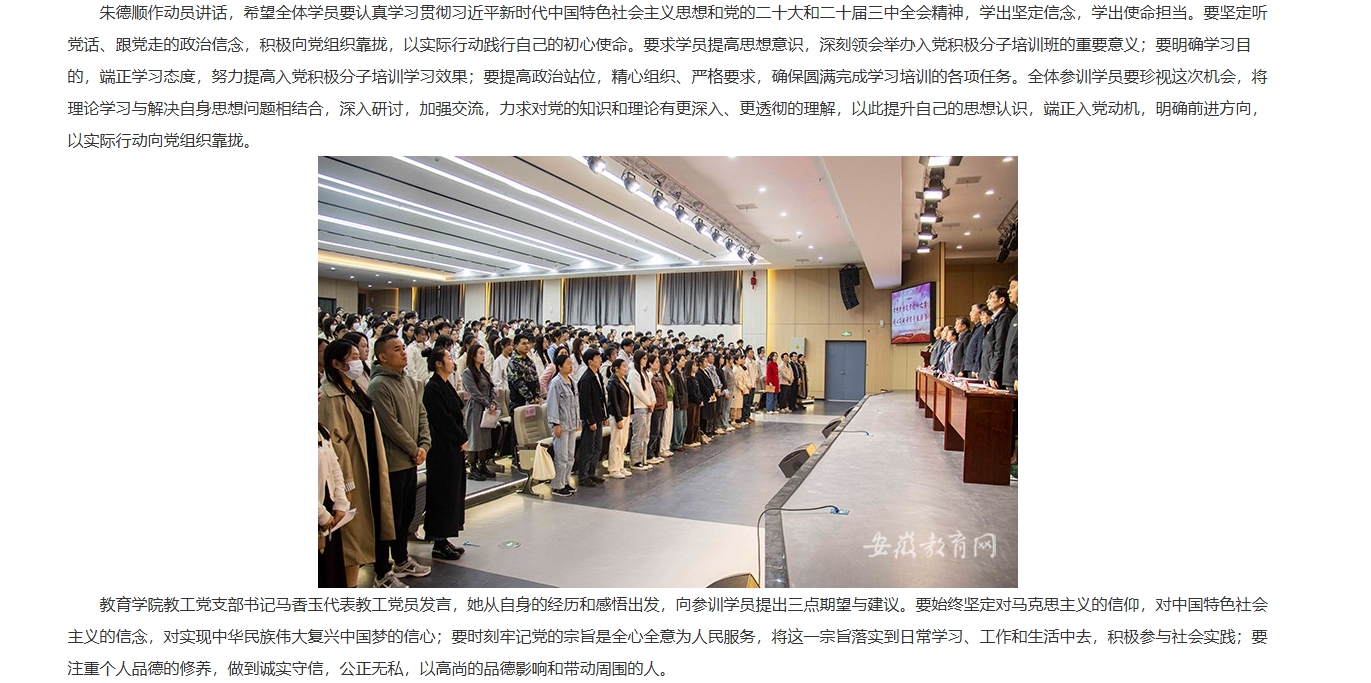 为贯彻落实新时代党的建设总要求,认真践行新时代党的组织路线,严把发展党员“入口关”,根据学校党建工作要求,10月30日下午,淮北理工学院举行第六期入党积极分子培训班开班式。校党委书记朱德顺,各党总支(直属党支部)书记、副书记,各党总支组织员、各党支部书记、全体参训学员参加。对此,安徽教育网进行了报道: