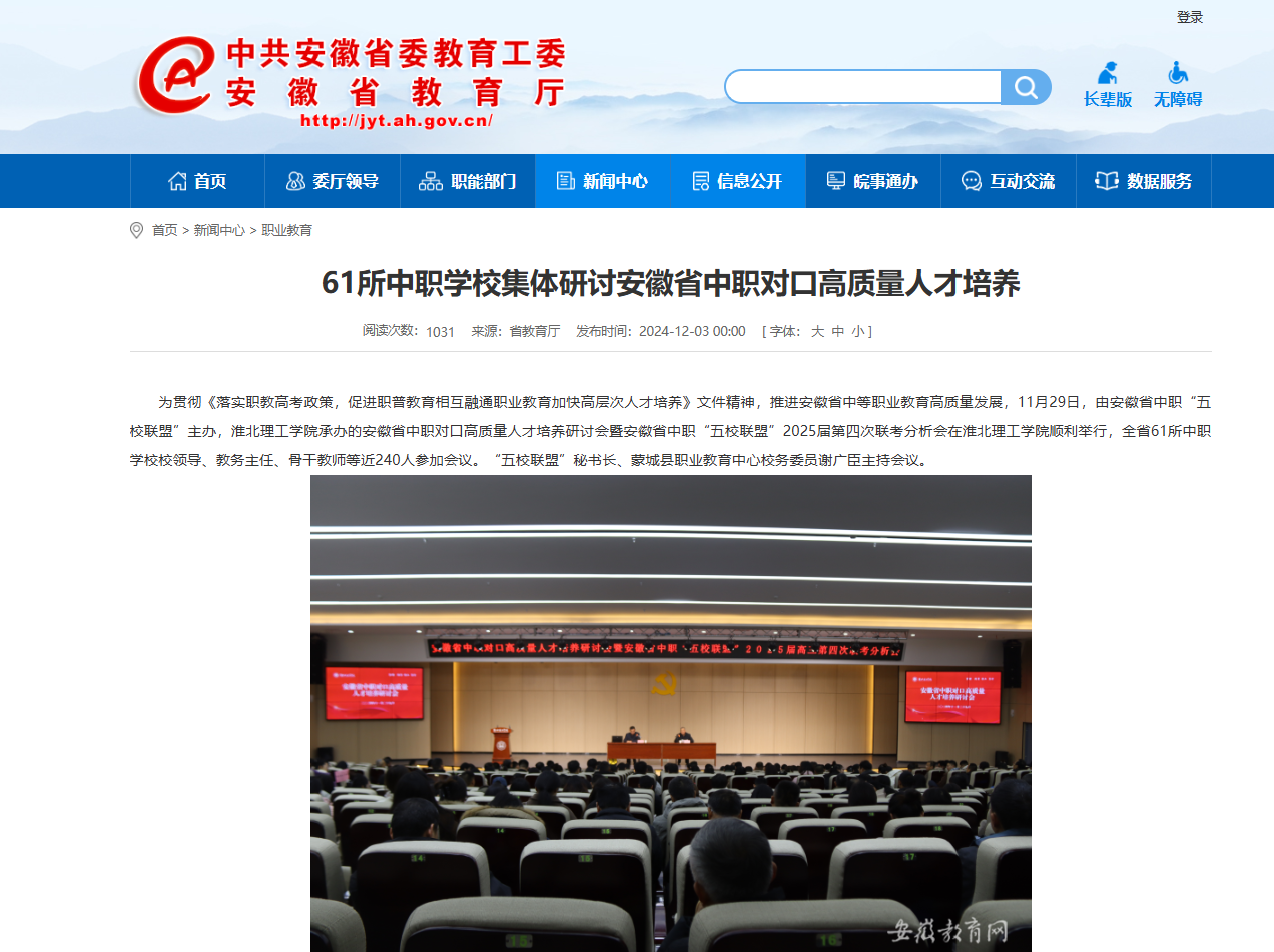 为贯彻《落实职教高考政策,促进职普教育相互融通职业教育加快高层次人才培养》文件精神,推进安徽省中等职业教育高质量发展,11月29日,由安徽省中职“五校联盟”主办,淮北理工学院承办的安徽省中职对口高质量人才培养研讨会暨安徽省中职“五校联盟”2025届第四次联考分析会在淮北理工学院顺利举行,全省61所中职学校校领导、教务主任、骨干教师等近240人参加会议。“五校联盟”秘书长、蒙城县职业教育中心校务委员谢广臣主持会议。对此,安徽教育网进行了报道: