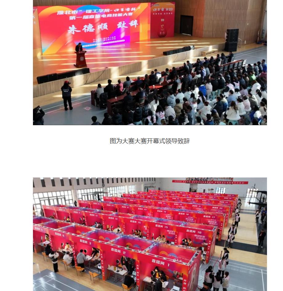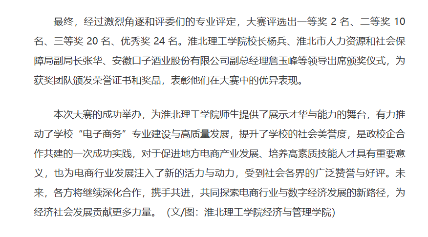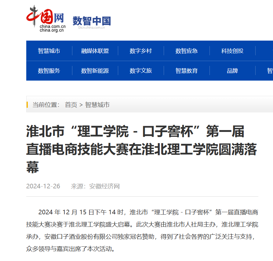2024 年 12 月 15 日下午 14 时,淮北市“理工学院 - 口子窖杯”第一届直播电商技能大赛决赛于淮北理工学院盛大启幕。此次大赛由淮北市人社局主办,淮北理工学院承办,安徽口子酒业股份有限公司独家冠名赞助,得到了社会各界的广泛关注与支持,众多领导与嘉宾出席了本次活动。对此,中国网进行了报道: