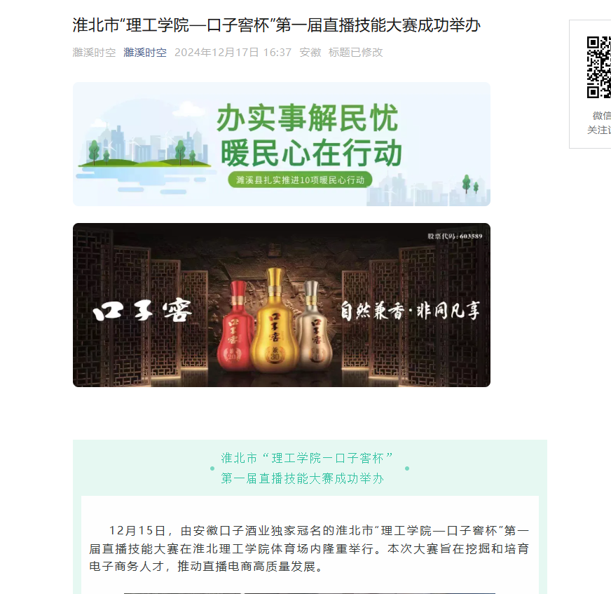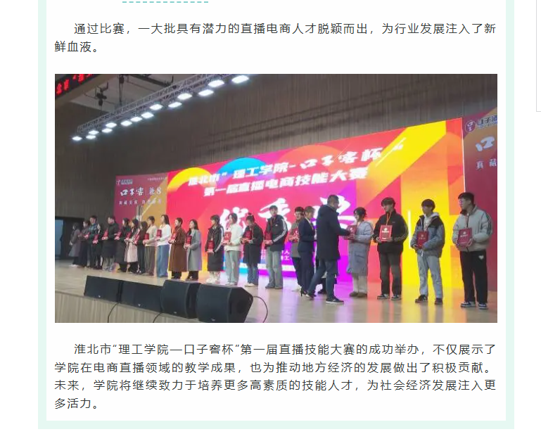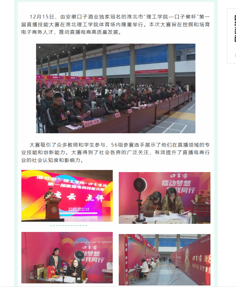 12月15日,由安徽口子酒业独家冠名的淮北市“理工学院—口子窖杯”第一届直播技能大赛在淮北理工学院体育场内隆重举行。本次大赛旨在挖掘和培育电子商务人才,推动直播电商高质量发展。对此,濉溪时空进行了报道: