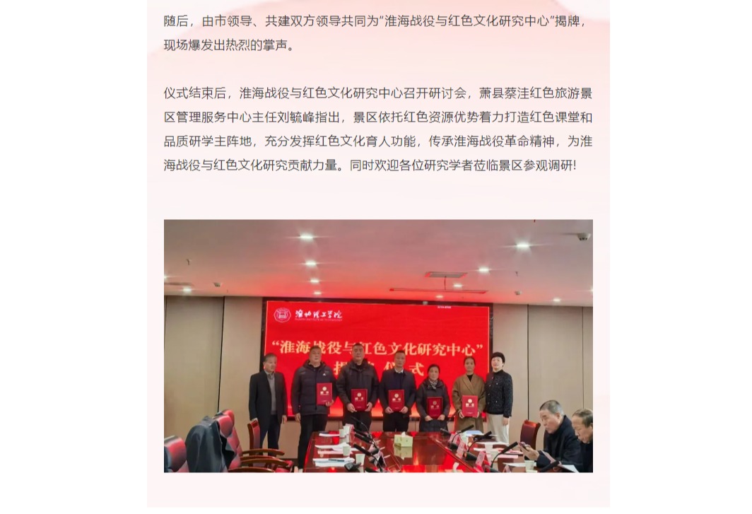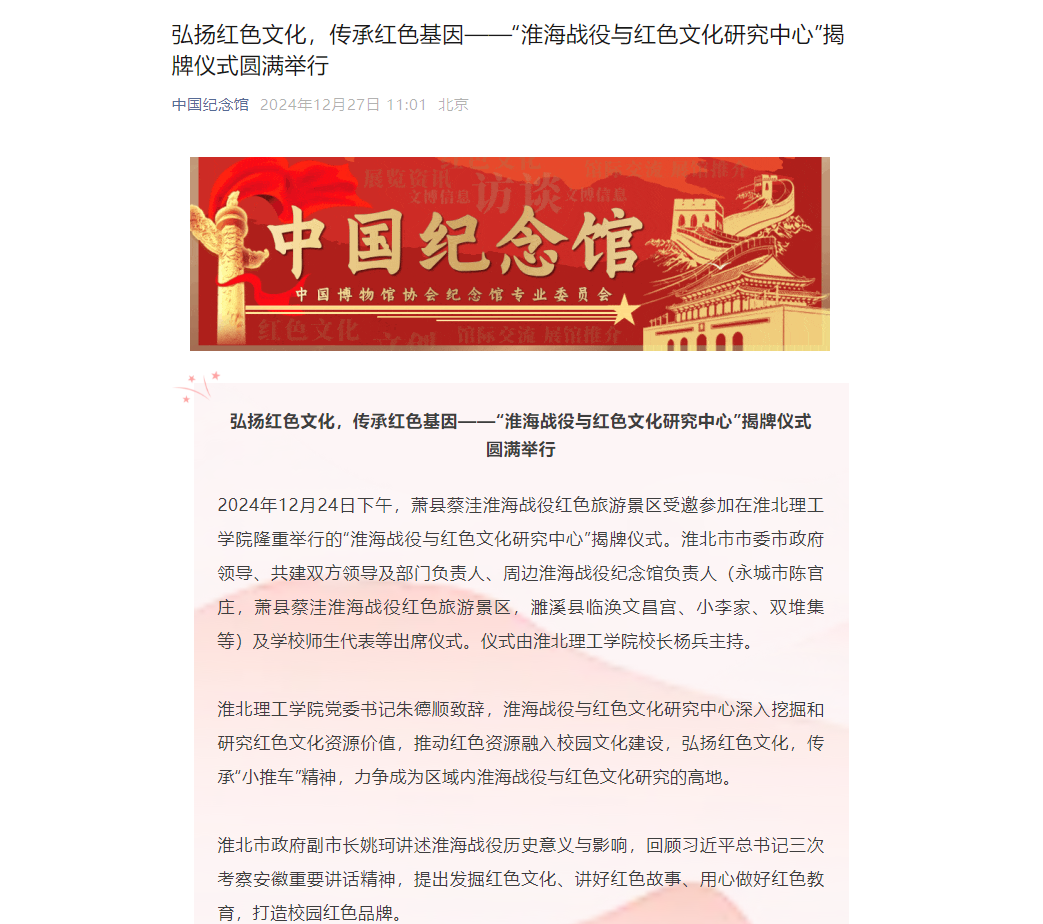 2024年12月24日下午,萧县蔡洼淮海战役红色旅游景区受邀参加在淮北理工学院隆重举行的“淮海战役与红色文化研究中心”揭牌仪式。淮北市市委市政府领导、共建双方领导及部门负责人、周边淮海战役纪念馆负责人(永城市陈官庄,萧县蔡洼淮海战役红色旅游景区,濉溪县临涣文昌宫、小李家、双堆集等)及学校师生代表等出席仪式。仪式由淮北理工学院校长杨兵主持。对此,中国纪念馆进行了报道: