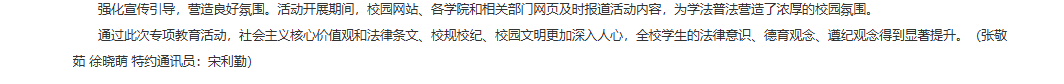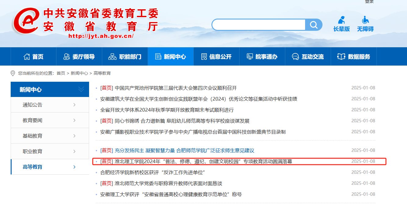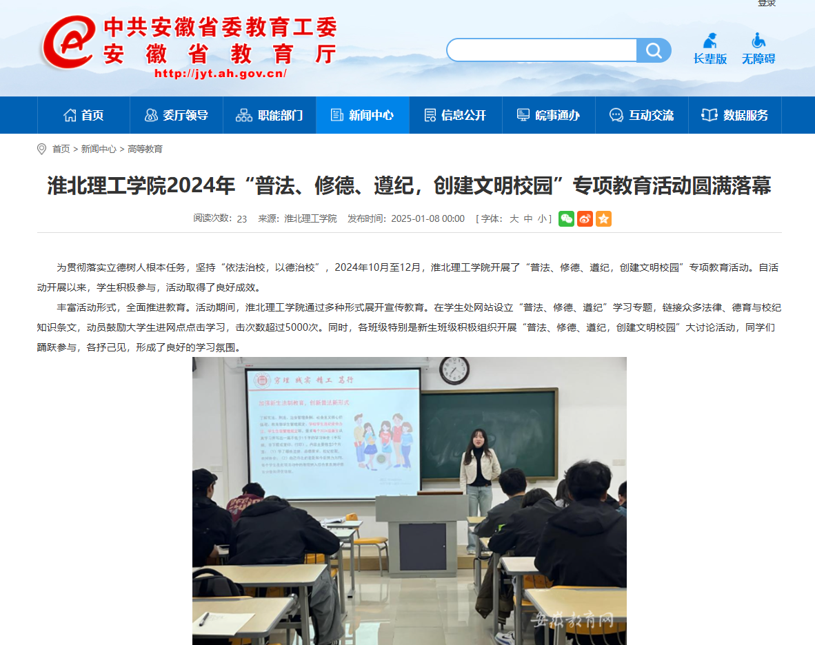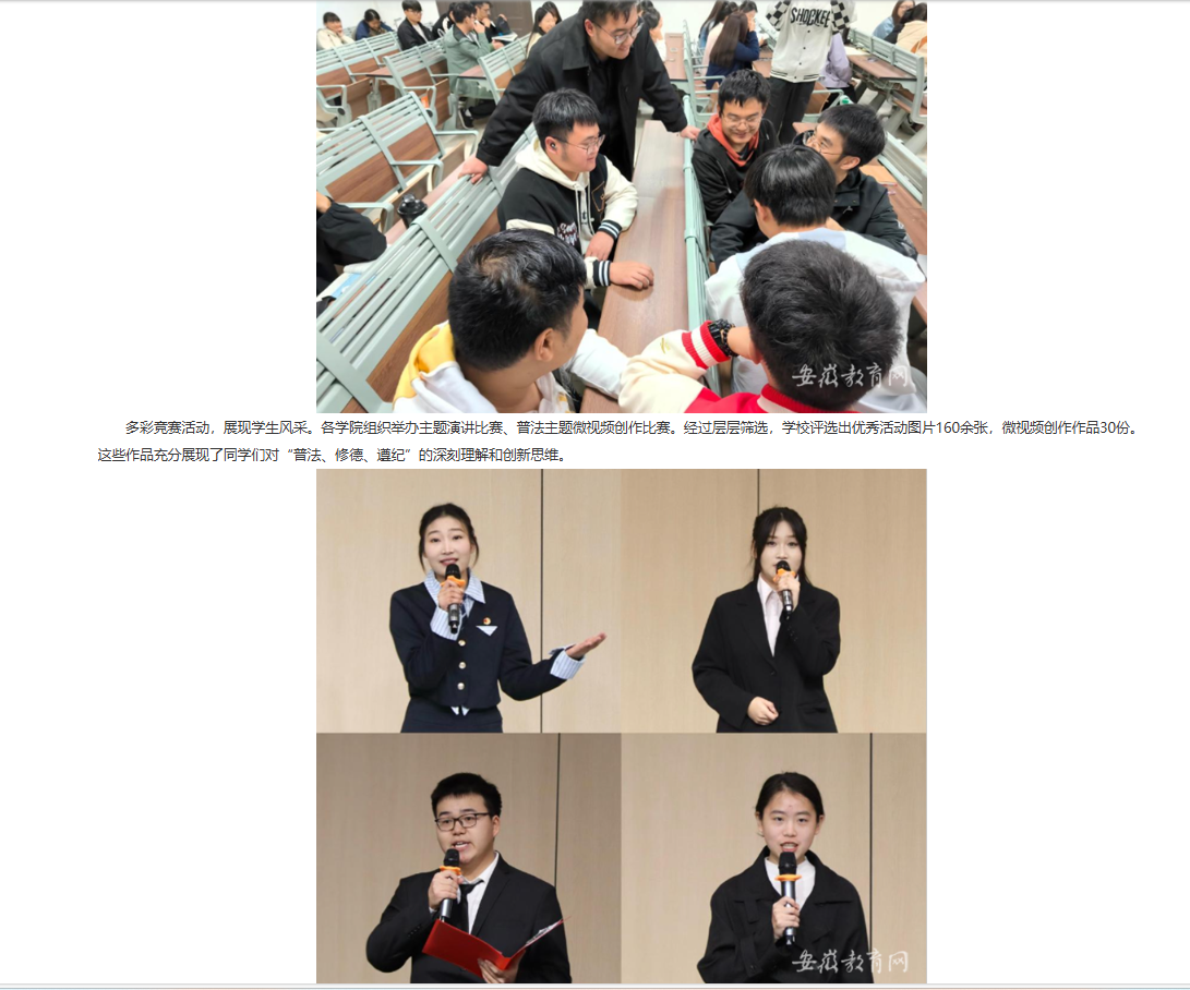 为贯彻落实立德树人根本任务,坚持“依法治校,以德治校”,2024年10月至12月,淮北理工学院开展了“普法、修德、遵纪,创建文明校园”专项教育活动。自活动开展以来,学生积极参与,活动取得了良好成效。对此,安徽教育网进行了报道:
