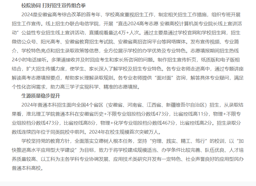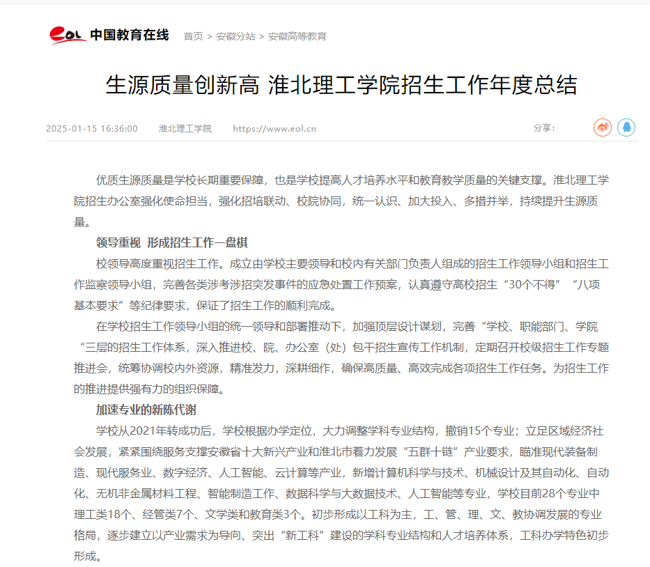 优质生源质量是学校长期重要保障,也是学校提高人才培养水平和教育教学质量的关键支撑。淮北理工学院招生办公室强化使命担当,强化招培联动、校院协同,统一认识、加大投入、多措并举,持续提升生源质量。对此,中国教育在线进行了报道: