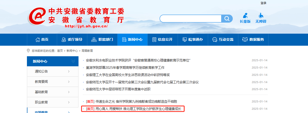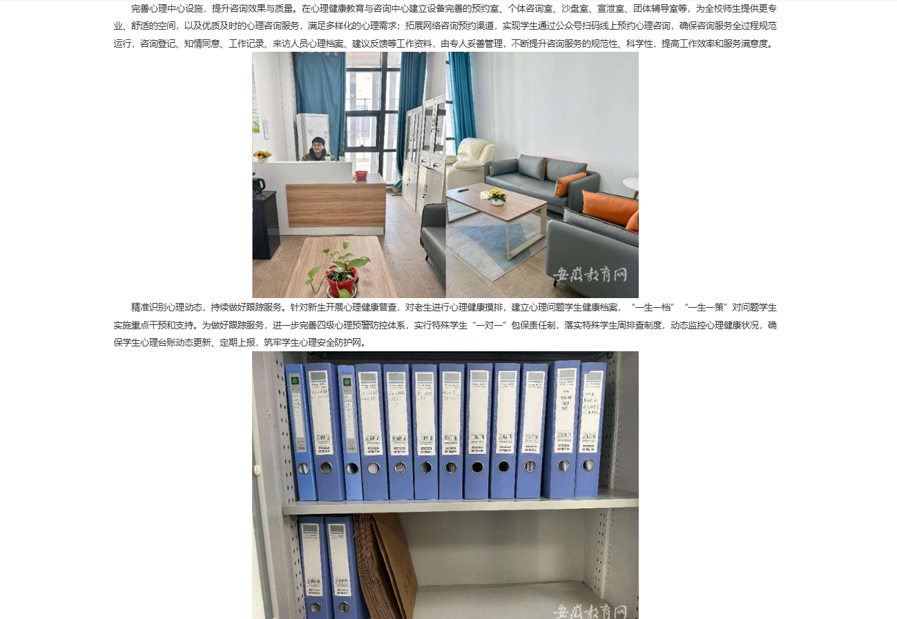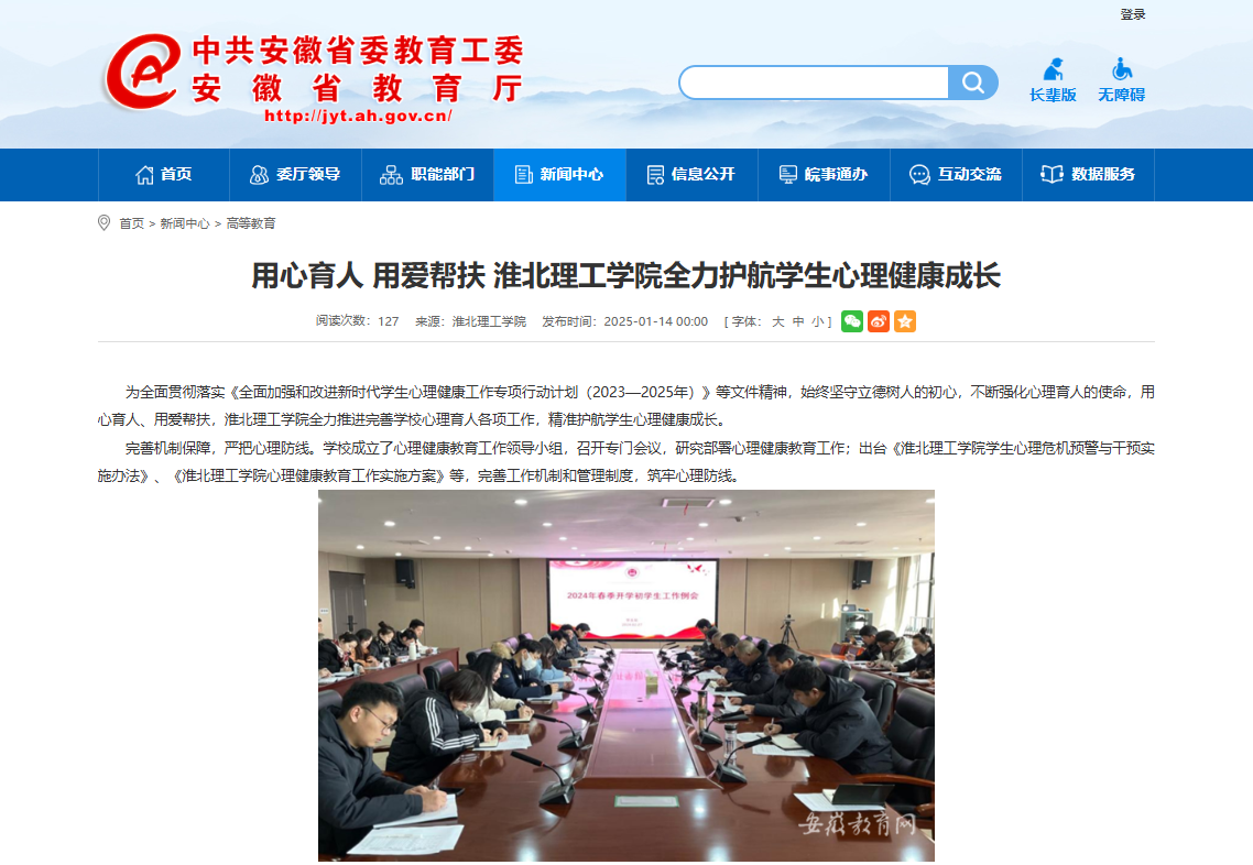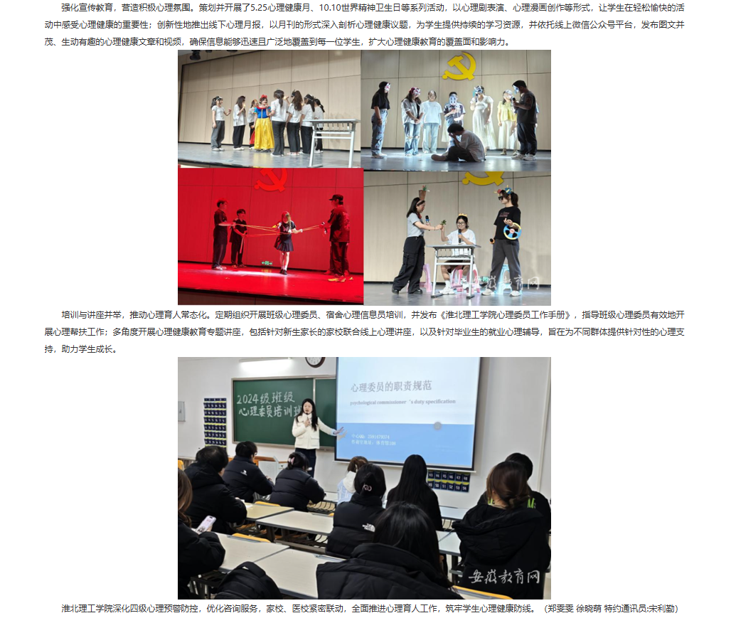 为全面贯彻落实《全面加强和改进新时代学生心理健康工作专项行动计划(2023—2025年)》等文件精神,始终坚守立德树人的初心,不断强化心理育人的使命,用心育人、用爱帮扶,淮北理工学院全力推进完善学校心理育人各项工作,精准护航学生心理健康成长。对此,安徽教育网进行了报道:
