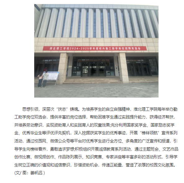 为落实立德树人根本任务,提升资助育人实效,淮北理工学院积极行动,通过构建资助体系、精准帮扶、思想引领协同推进资助工作,力求学生资助工作实现精准帮扶与全面发展并重,用心用情做好学生资助工作,助力学生成长成才。对此,基层网进行了报道: