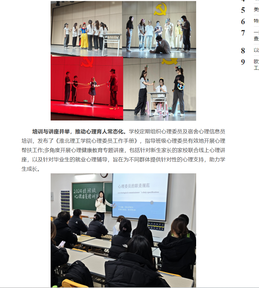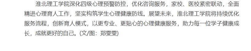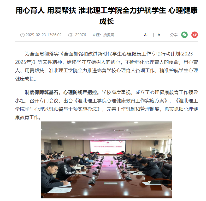 为全面贯彻落实《全面加强和改进新时代学生心理健康工作专项行动计划(2023—2025年)》等文件精神,始终坚守立德树人的初心,不断强化心理育人的使命,用心育人、用爱帮扶,淮北理工学院全力推进完善学校心理育人各项工作,精准护航学生心理健康成长。对此,中华网进行了报道: