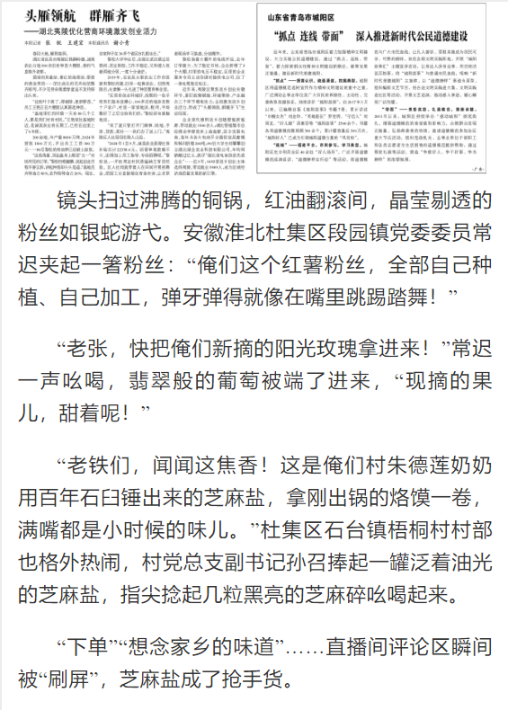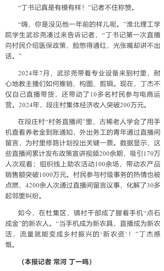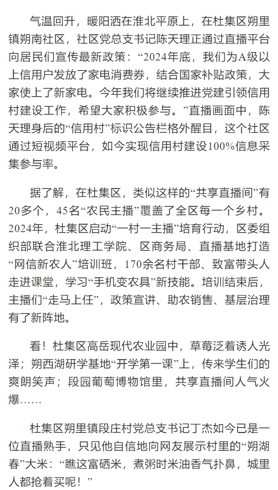2024年,杜集区启动“一村一主播”培育行动,区委组织部联合淮北理工学院、区商务局、直播基地打造“网信新农人”培训班,170余名村干部、致富带头人走进课堂,学习“手机变农具”新技能。2024年7月,淮北理工学院的武珍尧带着专业设备来到杜集区朔里镇段庄村,耐心地教主播们如何推销、构图、剪辑。现在,杜集区朔里镇段庄村党总支书记丁杰如今已是一位直播熟手,他不仅自己直播带货,还带动了10多名村民参与电商运营,2024年,段庄村集体经济收入突破200万元。对此,光明日报进行了报道: