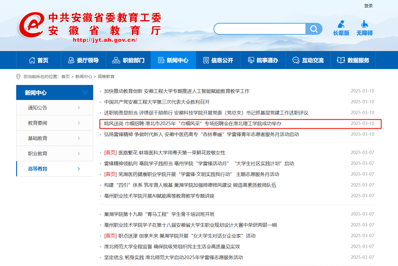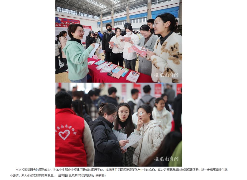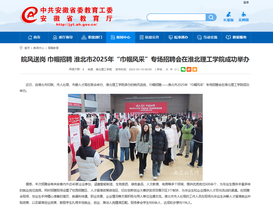 近日,由淮北市妇联、市人社局、市委人才局在联合举办、淮北理工学院承办的皖风送岗、巾帼招聘——淮北市2025年“巾帼风采”专场招聘会在淮北理工学院成功举办。对此,安徽教育网进行了报道: