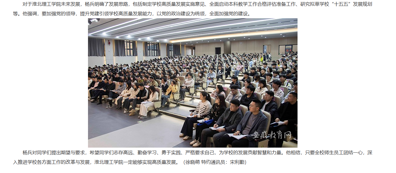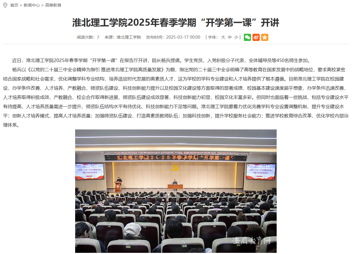 近日,淮北理工学院2025年春季学期“开学第一课”在报告厅开讲,院长杨兵授课。学生党员、入党积极分子代表,全体辅导员等450名师生参加。对此,安徽教育网进行了报道: