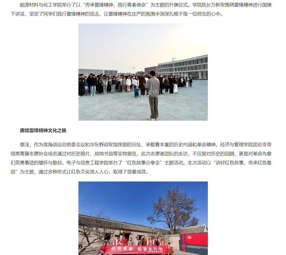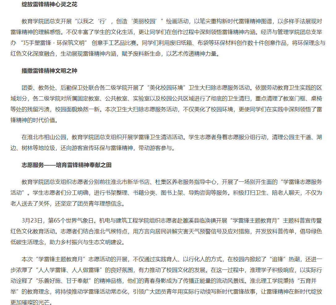 为进一步提升广大青年学子的责任意识和奉献精神。2025年3月,淮北理工学院围绕“五育并举”集中开展“学雷锋主题教育月”志愿服务活动。对此,人民政协网进行了报道: