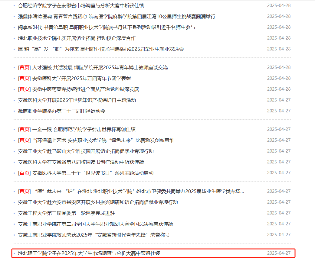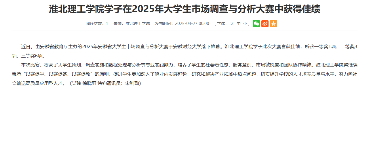 近日,由安徽省教育厅主办的2025年安徽省大学生市场调查与分析大赛于安徽财经大学落下帷幕。淮北理工学院学子此次大赛喜获佳绩,斩获一等奖1项、二等奖3项、三等奖6项。对此,安徽教育网进行了报道: