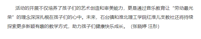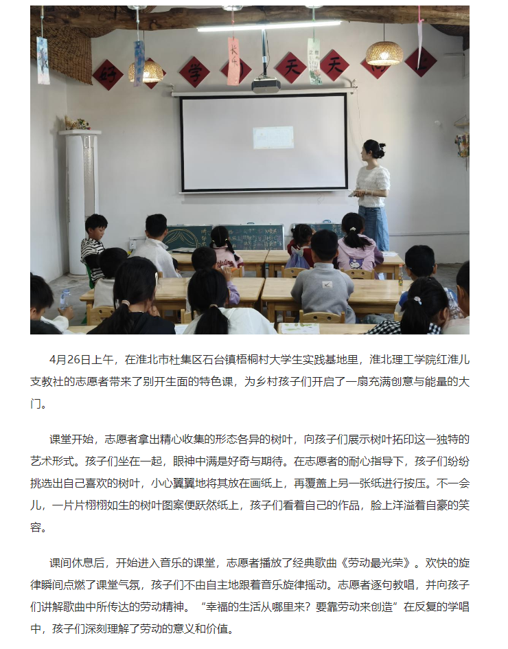 4月26日上午,在淮北市杜集区石台镇梧桐村大学生实践基地里,淮北理工学院红淮儿支教社的志愿者带来了别开生面的特色课,为乡村孩子们开启了一扇充满创意与能量的大门。对此,凤凰网安徽进行了报道: