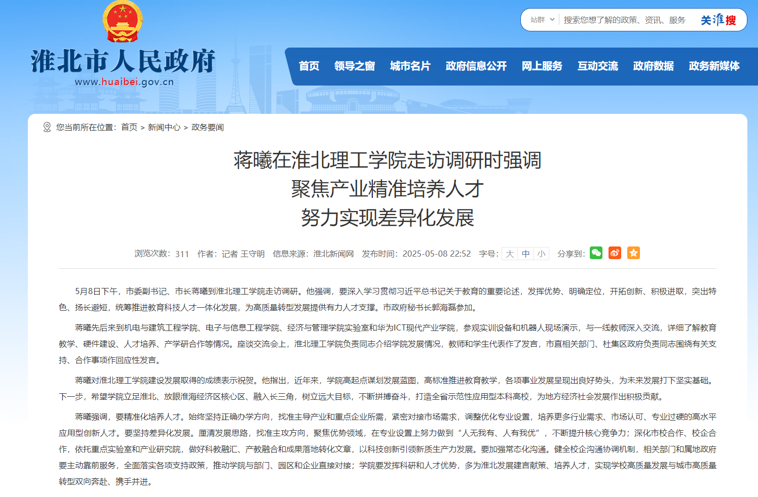 5月8日下午,市委副书记、市长蒋曦到淮北理工学院走访调研。他强调,要深入学习贯彻习近平总书记关于教育的重要论述,发挥优势、明确定位,开拓创新、积极进取,突出特色、扬长避短,统筹推进教育科技人才一体化发展,为高质量转型发展提供有力人才支撑。市政府秘书长郭海磊参加。对此,淮北市人民政府进行了报道: