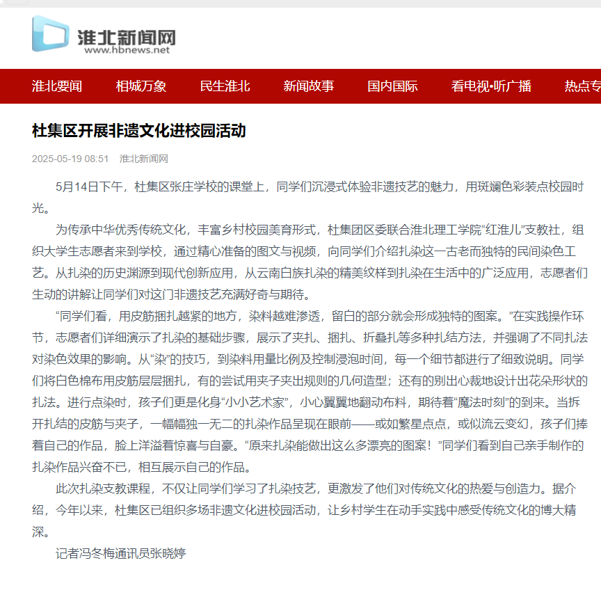 5月14日下午,杜集区张庄学校的课堂上,同学们沉浸式体验非遗技艺的魅力,用斑斓色彩装点校园时光。对此,淮北新闻网进行了报道: