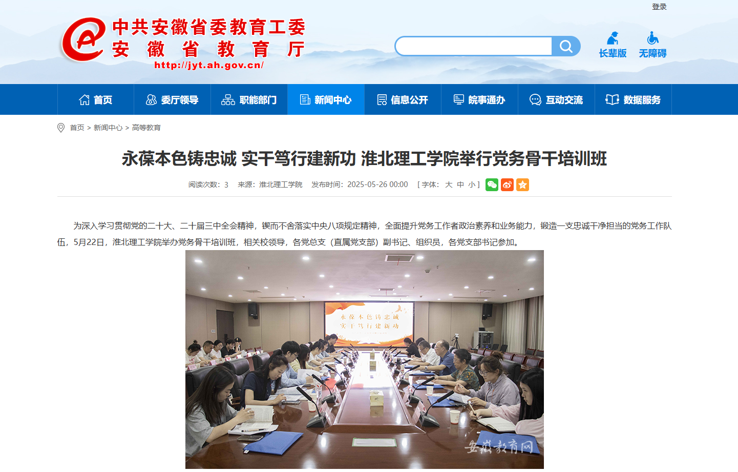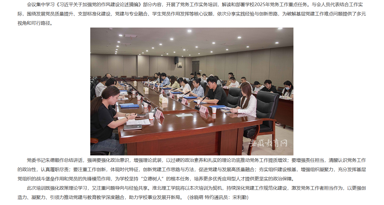 为深入学习贯彻党的二十大、二十届三中全会精神,锲而不舍落实中央八项规定精神,全面提升党务工作者政治素养和业务能力,锻造一支忠诚干净担当的党务工作队伍,5月22日,淮北理工学院举办党务骨干培训班,相关校领导,各党总支(直属党支部)副书记、组织员,各党支部书记参加。对此,安徽教育网进行了报道: