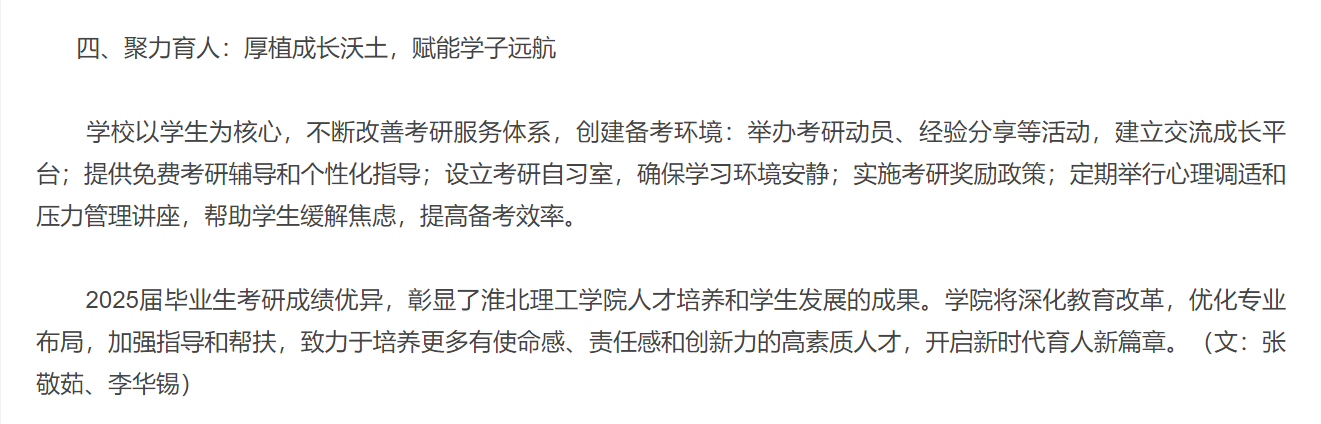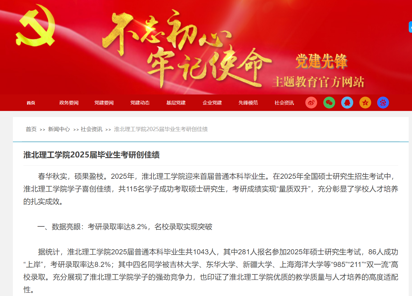 春华秋实,硕果盈枝。2025年,淮北理工学院迎来首届普通本科毕业生。在2025年全国硕士研究生招生考试中,淮北理工学院学子喜创佳绩,共115名学子成功考取硕士研究生,考研成绩实现“量质双升”,充分彰显了学校人才培养的扎实成效。对此,党建先锋网进行了报道: