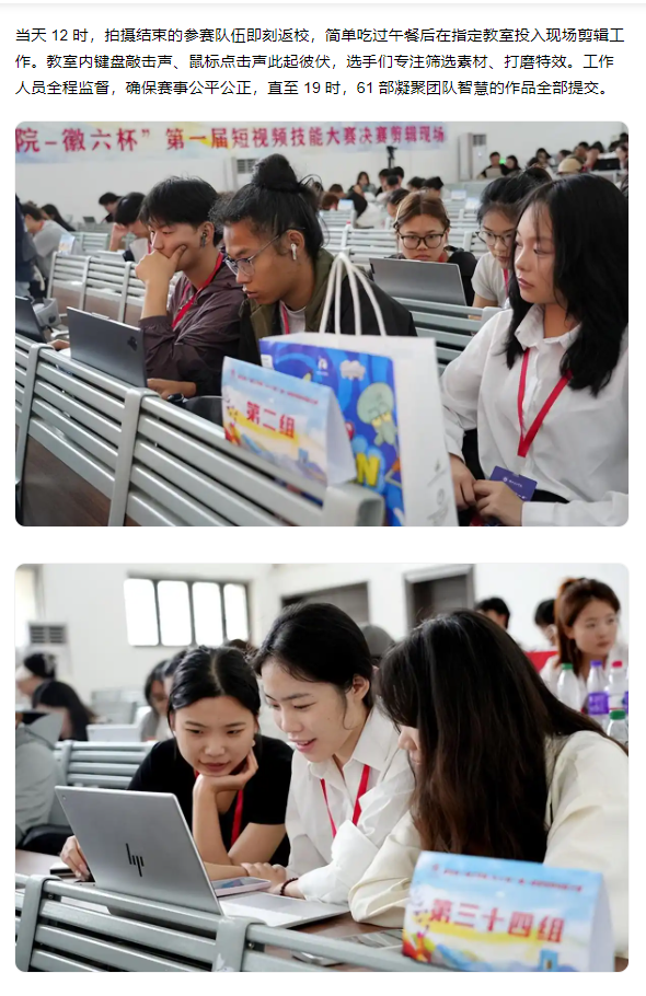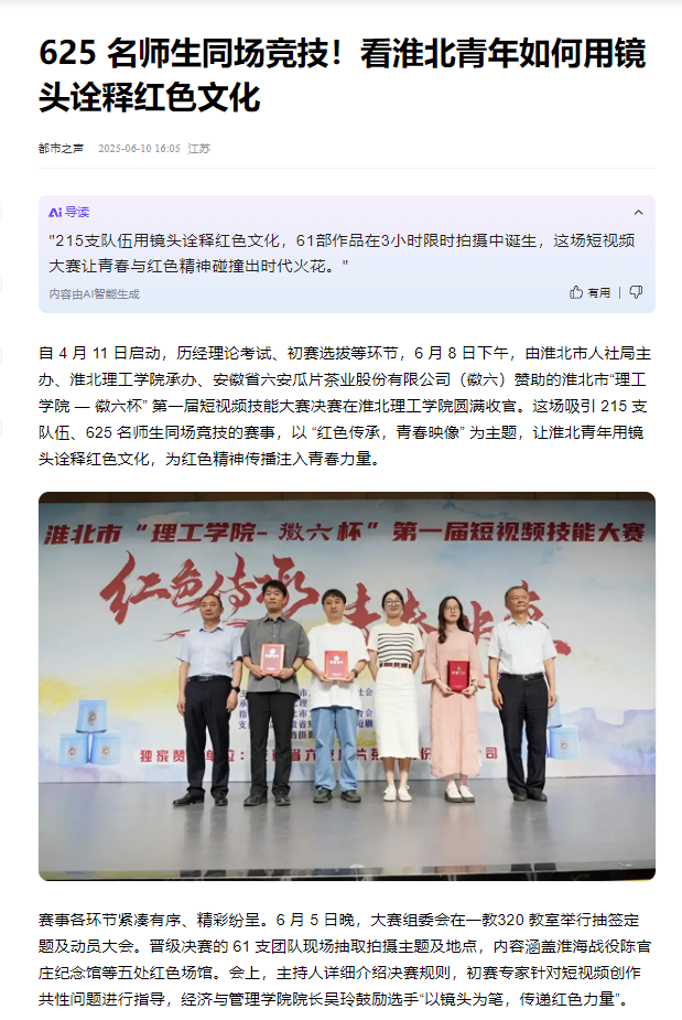 自4月11日启动,历经理论考试、初赛选拔等环节,6月8日下午,由淮北市人社局主办、淮北理工学院承办、安徽省六安瓜片茶业股份有限公司(徽六)赞助的淮北市“理工学院—徽六杯”第一届短视频技能大赛决赛在淮北理工学院圆满收官。这场吸引215支队伍、625名师生同场竞技的赛事,以“红色传承,青春映像”为主题,让淮北青年用镜头诠释红色文化,为红色精神传播注入青春力量。对此,都市之声进行了报道: