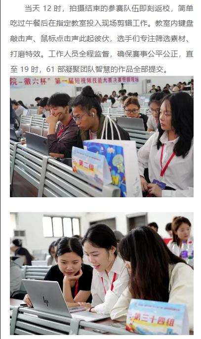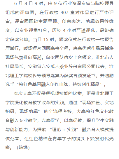 自4月11日启动,历经理论考试、初赛选拔等环节,6月8日下午,由淮北市人社局主办、淮北理工学院承办、安徽省六安瓜片茶业股份有限公司(徽六)赞助的淮北市“理工学院—徽六杯” 第一届短视频技能大赛决赛在淮北理工学院圆满收官。这场吸引215支队伍、625名师生同场竞技的赛事,以 “红色传承,青春映像” 为主题,让淮北青年用镜头诠释红色文化,为红色精神传播注入青春力量。对此,江苏之声进行了报道: