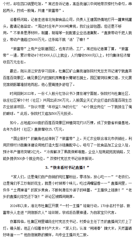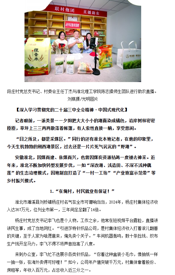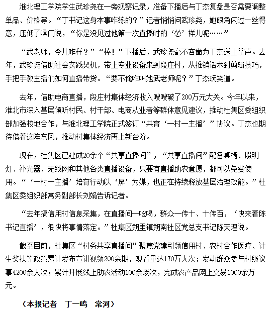 今年以来,淮北市深入基层倾听村民、村干部、电商从业者等群体意见建议,推动杜集区委组织部加强校地合作,与淮北理工学院正式签订“共育‘一村一主播’”协议。对此,光明网进行了报道:
