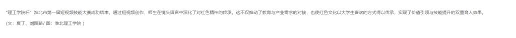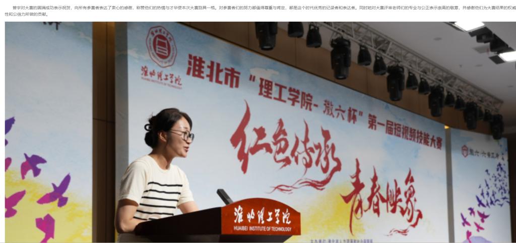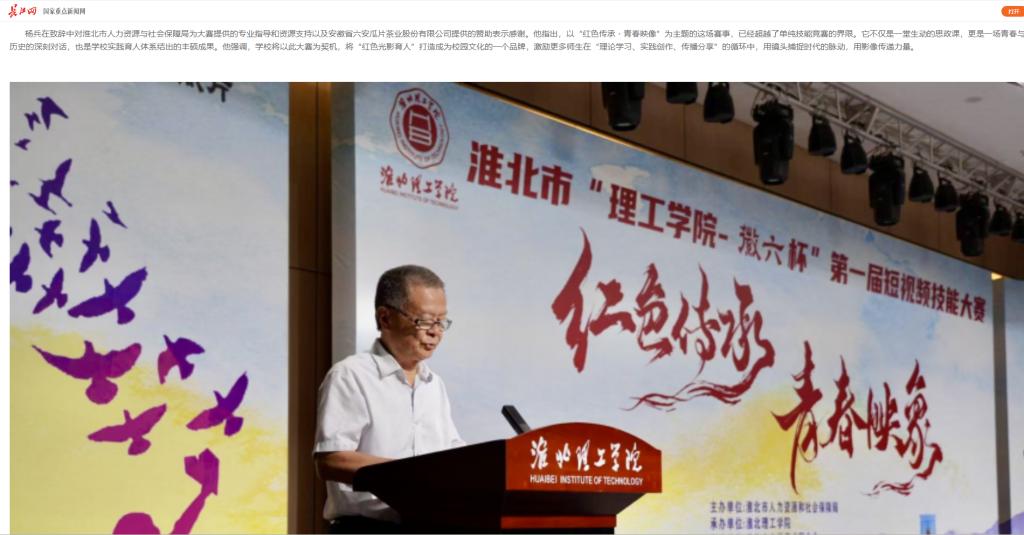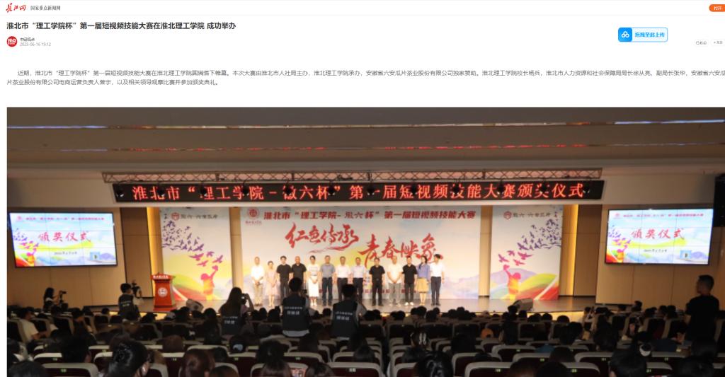 近期,淮北市“理工学院杯”第一届短视频技能大赛在淮北理工学院圆满落下帷幕。本次大赛由淮北市人社局主办,淮北理工学院承办,安徽省六安瓜片茶业股份有限公司独家赞助。淮北理工学院校长杨兵,淮北市人力资源和社会保障局局长徐从亮、副局长张华,安徽省六安瓜片茶业股份有限公司电商运营负责人曾宇,以及相关领导观摩比赛并参加颁奖典礼。对此,长江网进行了报道: