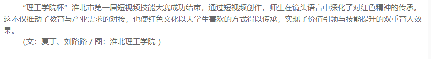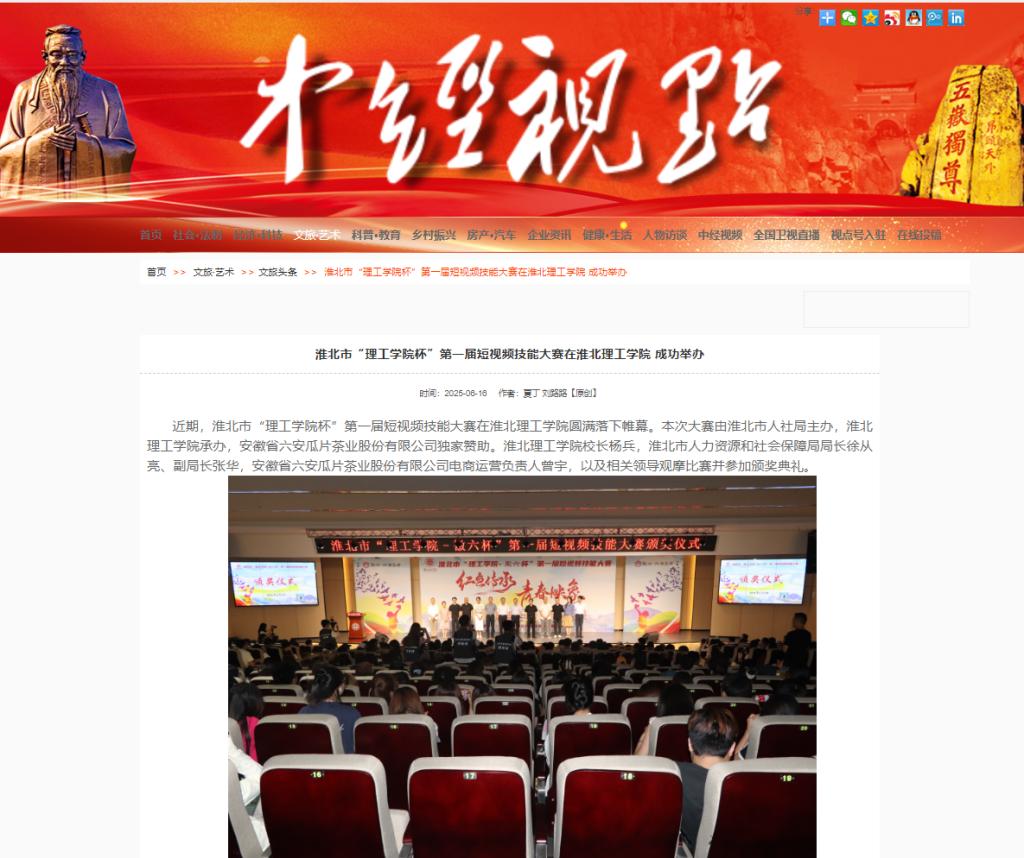 近期,淮北市“理工学院杯”第一届短视频技能大赛在淮北理工学院圆满落下帷幕。本次大赛由淮北市人社局主办,淮北理工学院承办,安徽省六安瓜片茶业股份有限公司独家赞助。淮北理工学院校长杨兵,淮北市人力资源和社会保障局局长徐从亮、副局长张华,安徽省六安瓜片茶业股份有限公司电商运营负责人曾宇,以及相关领导观摩比赛并参加颁奖典礼。对此,中经视点网进行了报道: