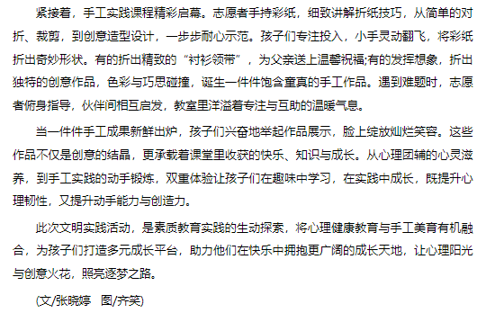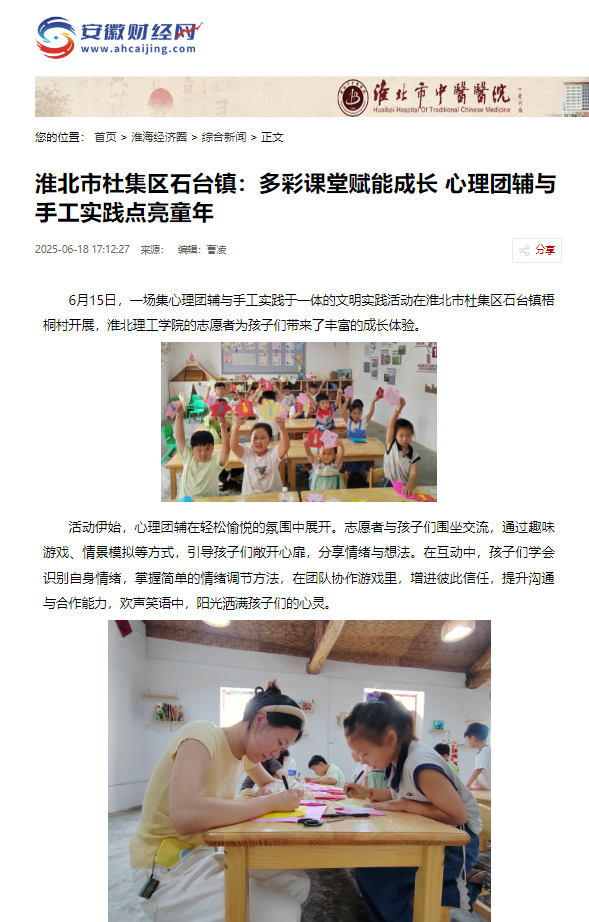 6月15日,一场集心理团辅与手工实践于一体的文明实践活动在淮北市杜集区石台镇梧桐村开展,淮北理工学院的志愿者为孩子们带来了丰富的成长体验。对此,安徽财经网进行了报道: