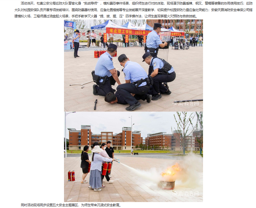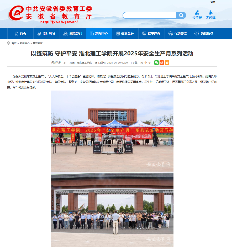 为深入贯彻落实安全生产月“人人讲安全、个个会应急”主题精神,切实提升师生安全意识与应急能力,6月18日,淮北理工学院举办安全生产月系列活动。副院长郑来纪,淮北市杜集公安分局巡防大队、禁毒大队、警务站、安徽天路消防安全维保公司、电梯维保公司等官兵,学生处、后勤保卫处、团委等部门负责人及二级学院书记助理、学生代表参与活动。对此,安徽教育网进行了报道: