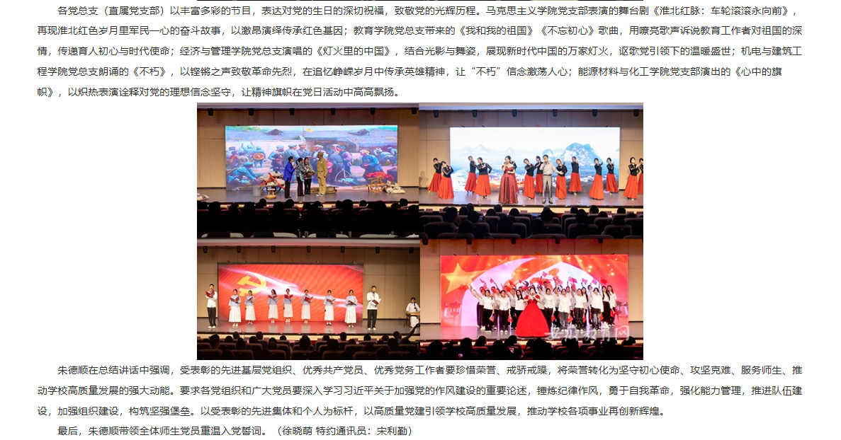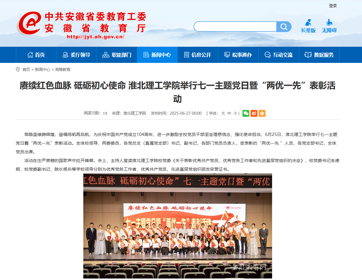 筚路蓝缕铸辉煌,奋楫扬帆再启航,为庆祝中国共产党成立104周年,进一步激励全校党员干部坚定理想信念、强化使命担当,6月25日,淮北理工学院举行七一主题党日暨“两优一先”表彰活动。全体校领导,两委委员,各党总支(直属党支部)书记、副书记,各部门党员负责人,受表彰的“两优一先 ”人员,各党支部书记,全体党员出席。对此,安徽教育网进行了报道: