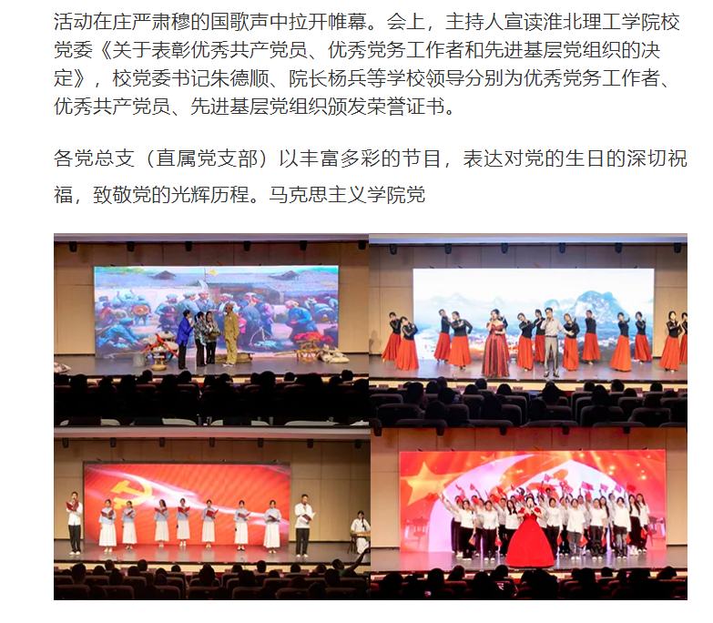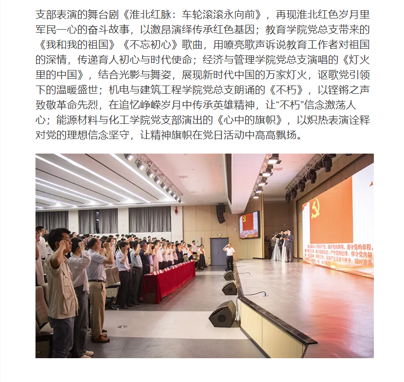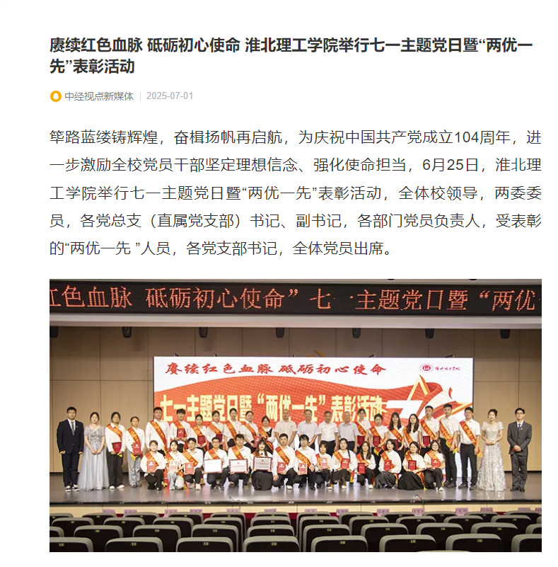筚路蓝缕铸辉煌,奋楫扬帆再启航,为庆祝中国共产党成立104周年,进一步激励全校党员干部坚定理想信念、强化使命担当,6月25日,淮北理工学院举行七一主题党日暨“两优一先”表彰活动,全体校领导,两委委员,各党总支(直属党支部)书记、副书记,各部门党员负责人,受表彰的“两优一先 ”人员,各党支部书记,全体党员出席。对此,中经视点新媒体进行了报道: