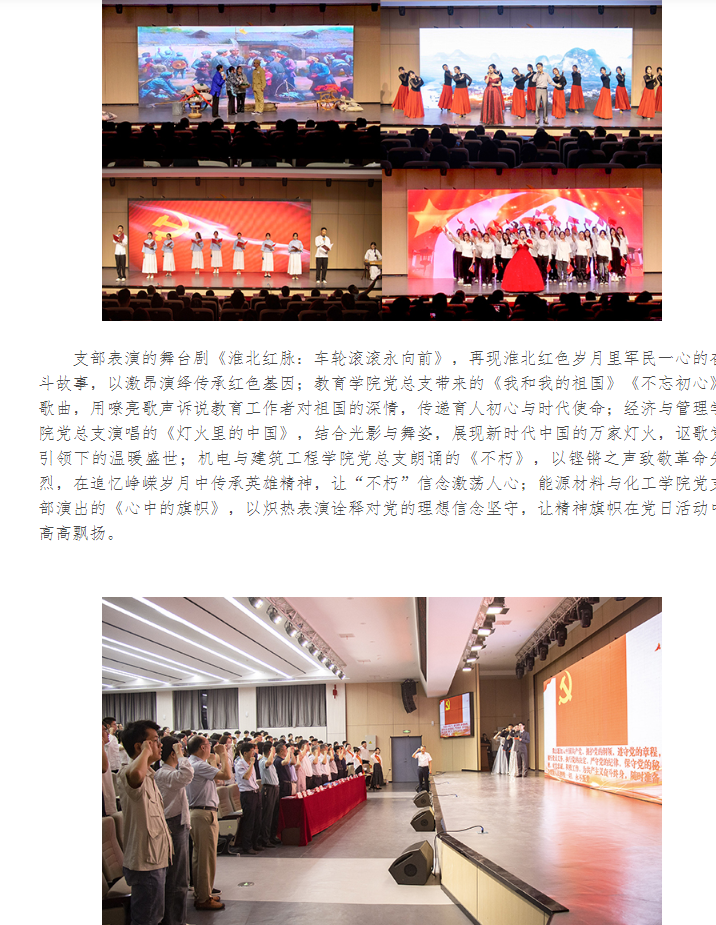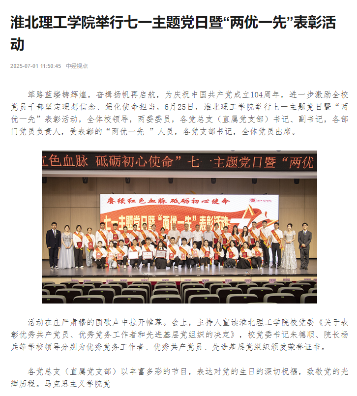 筚路蓝缕铸辉煌,奋楫扬帆再启航,为庆祝中国共产党成立104周年,进一步激励全校党员干部坚定理想信念、强化使命担当,6月25日,淮北理工学院举行七一主题党日暨“两优一先”表彰活动,全体校领导,两委委员,各党总支(直属党支部)书记、副书记,各部门党员负责人,受表彰的“两优一先 ”人员,各党支部书记,全体党员出席。对此,大象新闻进行了报道: