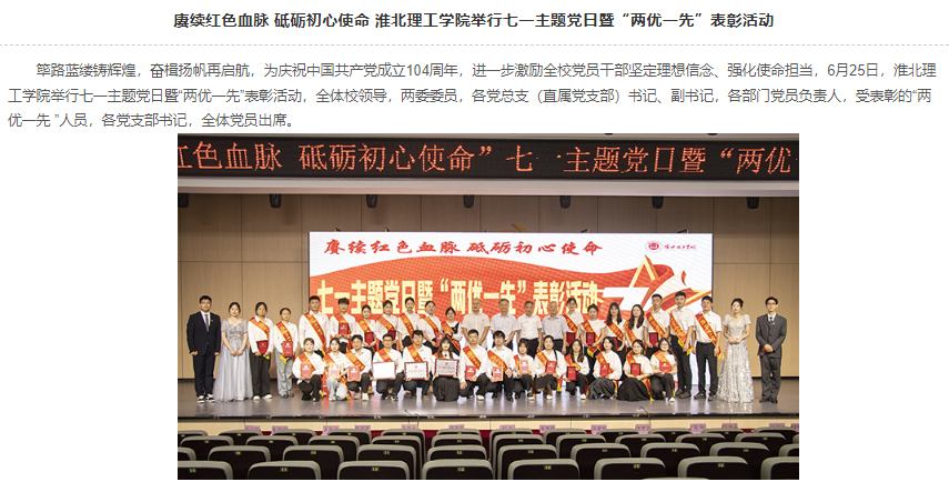 筚路蓝缕铸辉煌,奋楫扬帆再启航,为庆祝中国共产党成立104周年,进一步激励全校党员干部坚定理想信念、强化使命担当,6月25日,淮北理工学院举行七一主题党日暨“两优一先”表彰活动,全体校领导,两委委员,各党总支(直属党支部)书记、副书记,各部门党员负责人,受表彰的“两优一先 ”人员,各党支部书记,全体党员出席。对此,中经视点进行了报道: