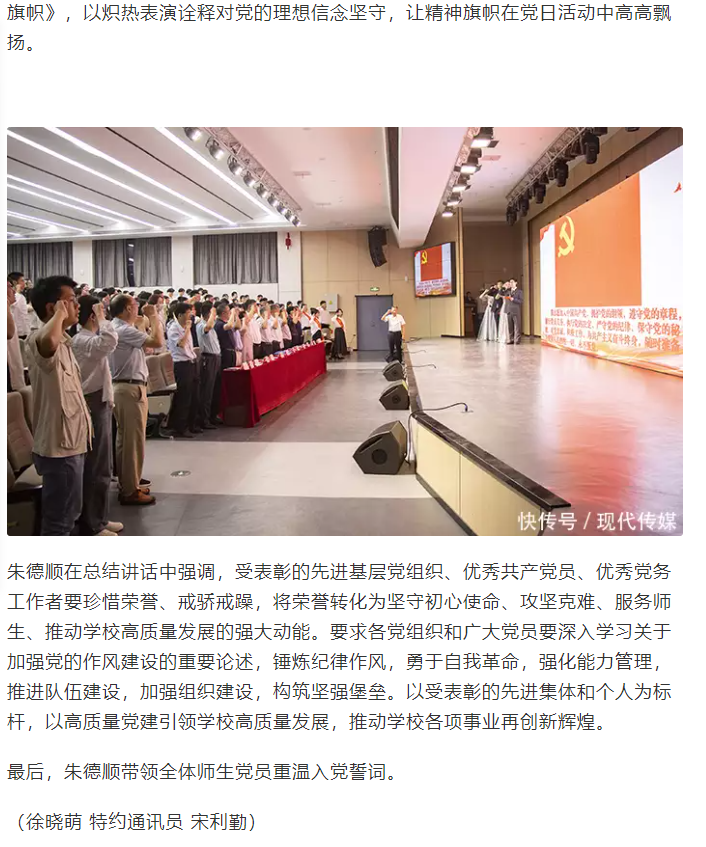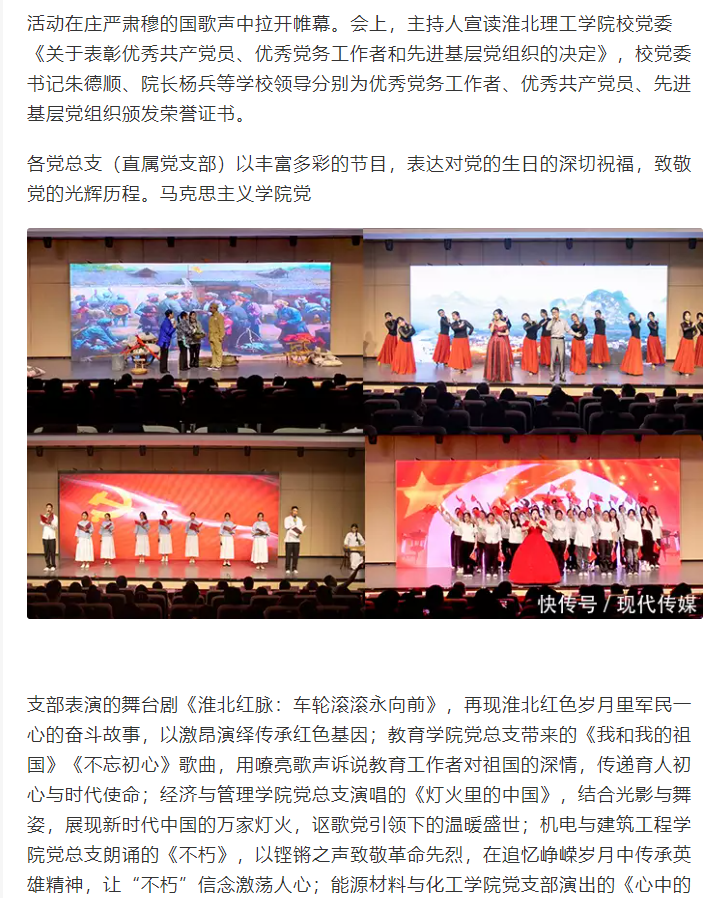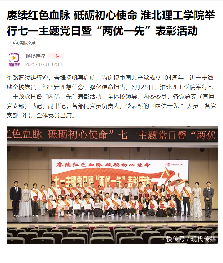 筚路蓝缕铸辉煌,奋楫扬帆再启航,为庆祝中国共产党成立104周年,进一步激励全校党员干部坚定理想信念、强化使命担当,6月25日,淮北理工学院举行七一主题党日暨“两优一先”表彰活动,全体校领导,两委委员,各党总支(直属党支部)书记、副书记,各部门党员负责人,受表彰的“两优一先 ”人员,各党支部书记,全体党员出席。对此,快咨询进行了报道: