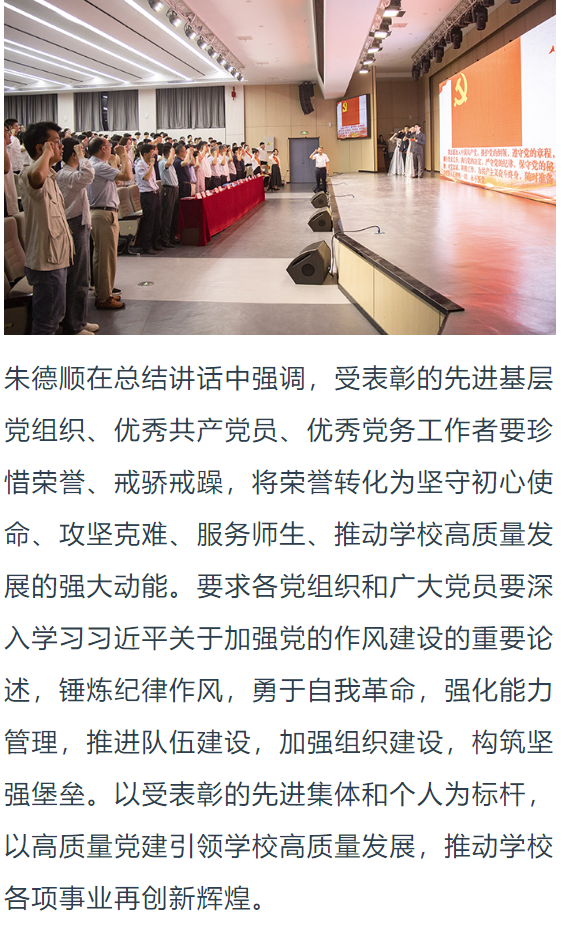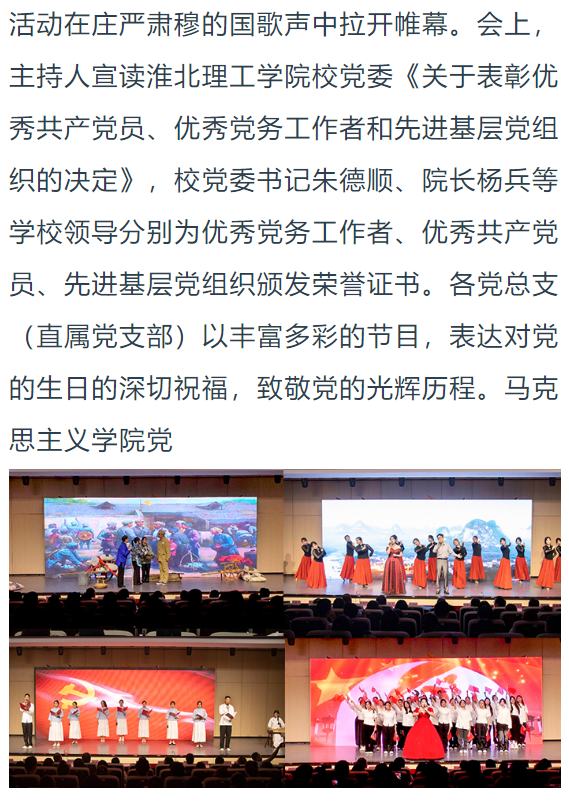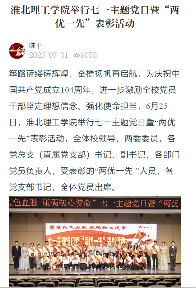 筚路蓝缕铸辉煌,奋楫扬帆再启航,为庆祝中国共产党成立104周年,进一步激励全校党员干部坚定理想信念、强化使命担当,6月25日,淮北理工学院举行七一主题党日暨“两优一先”表彰活动,全体校领导,两委委员,各党总支(直属党支部)书记、副书记,各部门党员负责人,受表彰的“两优一先 ”人员,各党支部书记,全体党员出席。对此,光明教育家进行了报道: