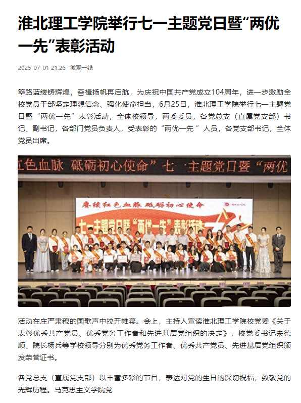 筚路蓝缕铸辉煌,奋楫扬帆再启航,为庆祝中国共产党成立104周年,进一步激励全校党员干部坚定理想信念、强化使命担当,6月25日,淮北理工学院举行七一主题党日暨“两优一先”表彰活动,全体校领导,两委委员,各党总支(直属党支部)书记、副书记,各部门党员负责人,受表彰的“两优一先 ”人员,各党支部书记,全体党员出席。对此,今日头条进行了报道: