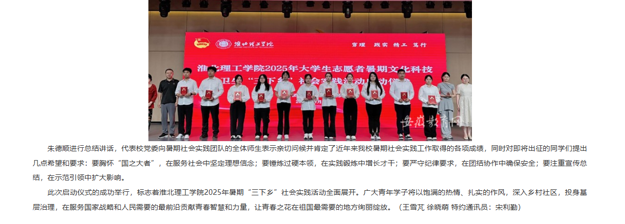 为贯彻习近平新时代中国特色社会主义思想和党的二十大精神,引导青年学生在社会实践中成长。近日,淮北理工学院举办2025年大学生志愿者暑期“三下乡”社会实践启动仪式。淮北理工学院党委书记朱德顺、淮北市委宣传部宣传教育科科长李墨涵、淮北市文体旅局文物科主任解华顶、淮北市相关红色场馆负责人及学校相关部门负责人参加,400余名师生代表参加仪式。对此,安徽教育网进行了报道:
