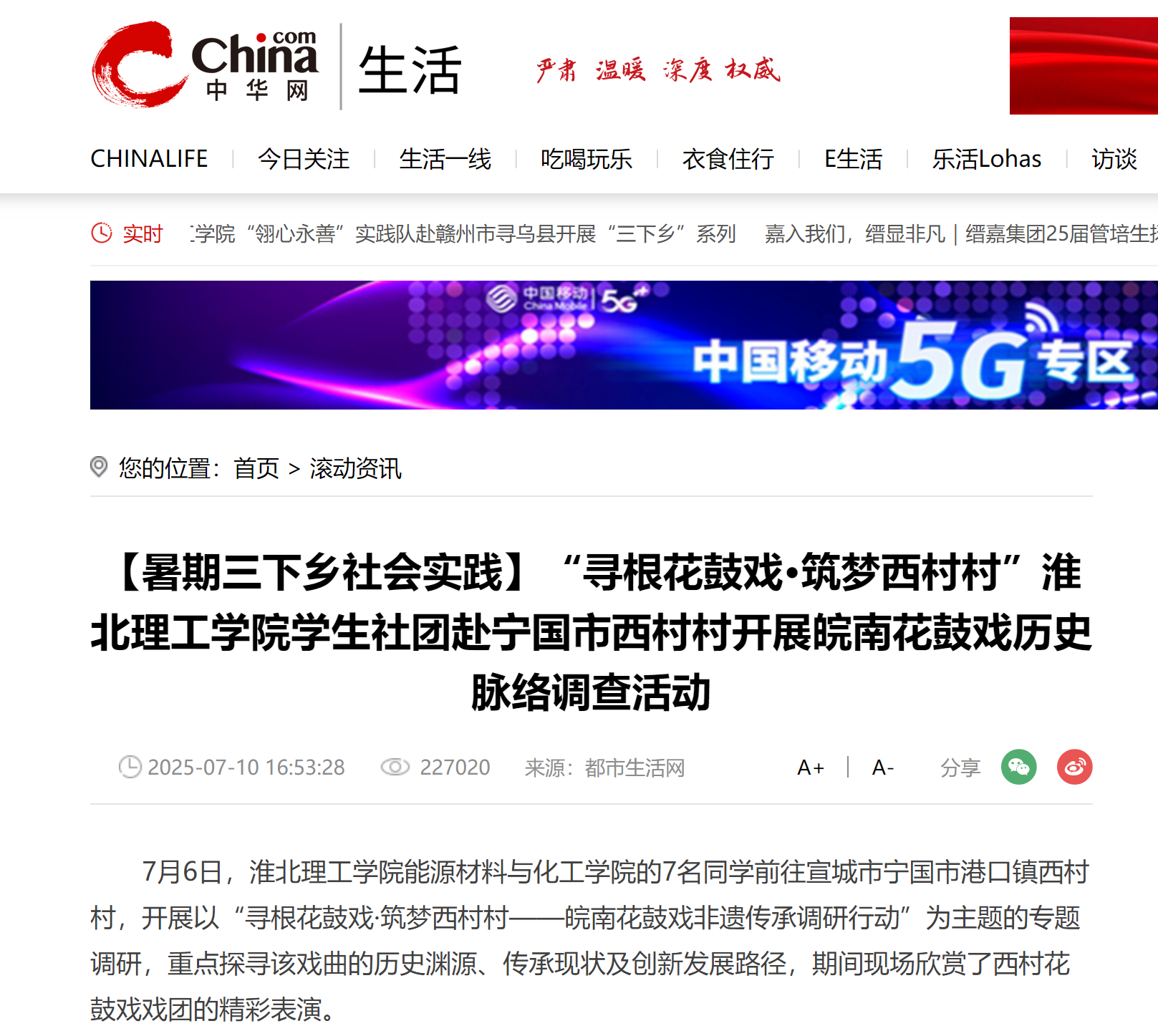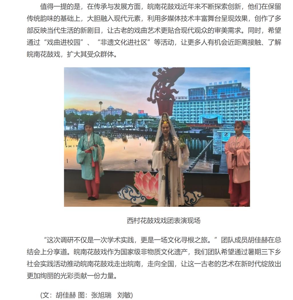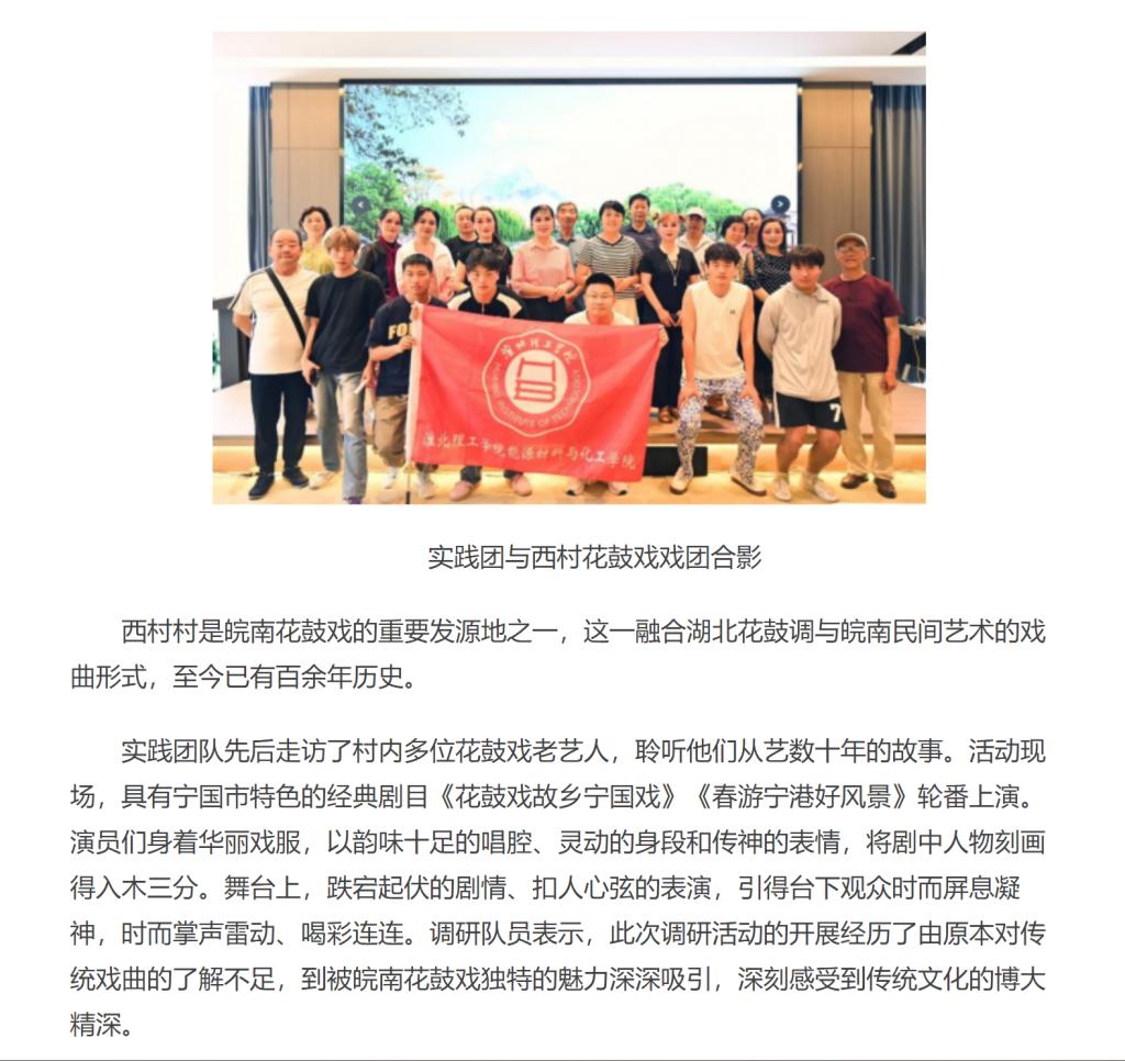 7月6日,淮北理工学院能源材料与化工学院的7名同学前往宣城市宁国市港口镇西村村,开展以“寻根花鼓戏·筑梦西村村——皖南花鼓戏非遗传承调研行动”为主题的专题调研,重点探寻该戏曲的历史渊源、传承现状及创新发展路径,期间现场欣赏了西村花鼓戏戏团的精彩表演。对此,中华网进行了报道: