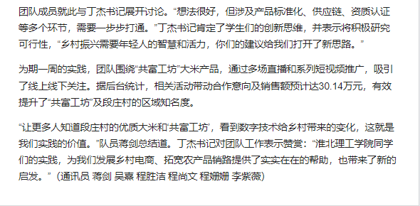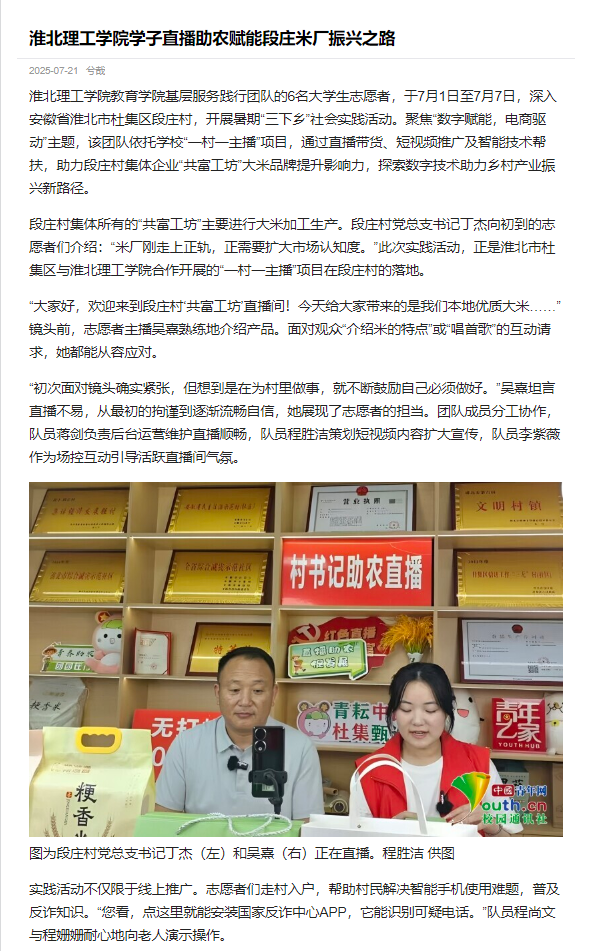 淮北理工学院教育学院基层服务践行团队的6名大学生志愿者,于7月1日至7月7日,深入安徽省淮北市杜集区段庄村,开展暑期“三下乡”社会实践活动。聚焦“数字赋能,电商驱动”主题,该团队依托学校“一村一主播”项目,通过直播带货、短视频推广及智能技术帮扶,助力段庄村集体企业“共富工坊”大米品牌提升影响力,探索数字技术助力乡村产业振兴新路径。对此,中国青年网进行了报道: