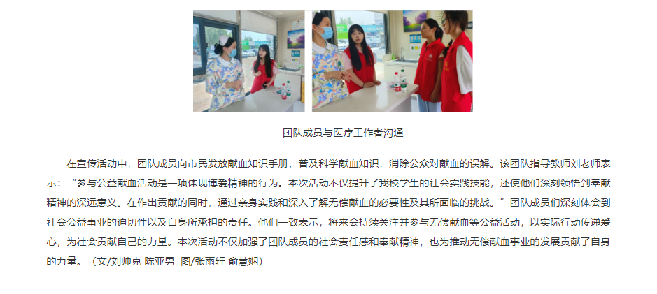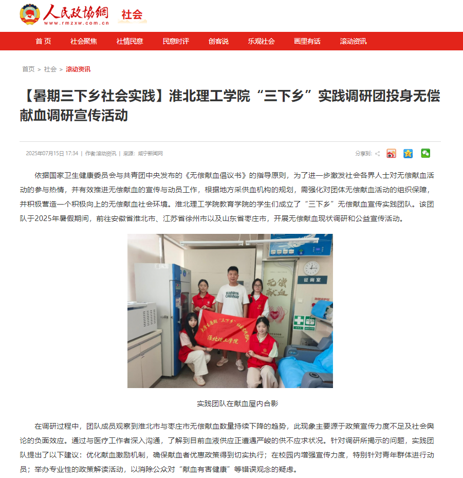 依据国家卫生健康委员会与共青团中央发布的《无偿献血倡议书》的指导原则,为了进一步激发社会各界人士对无偿献血活动的参与热情,并有效推进无偿献血的宣传与动员工作,根据地方采供血机构的规划,需强化对团体无偿献血活动的组织保障,并积极营造一个积极向上的无偿献血社会环境。淮北理工学院教育学院的学生们成立了“三下乡”无偿献血宣传实践团队。该团队于2025年暑假期间,前往安徽省淮北市、江苏省徐州市以及山东省枣庄市,开展无偿献血现状调研和公益宣传活动。对此,人民政协网进行了报道:
